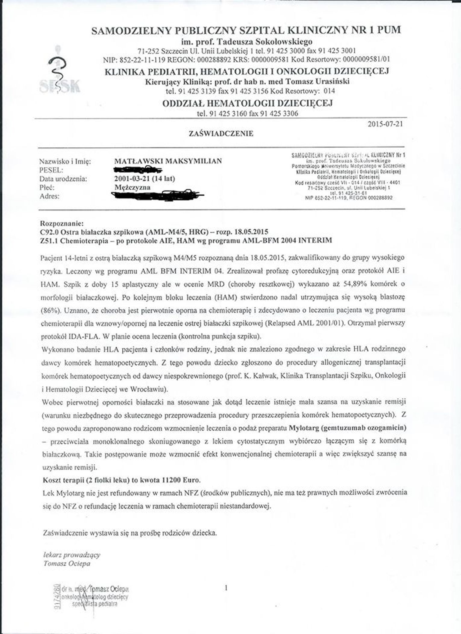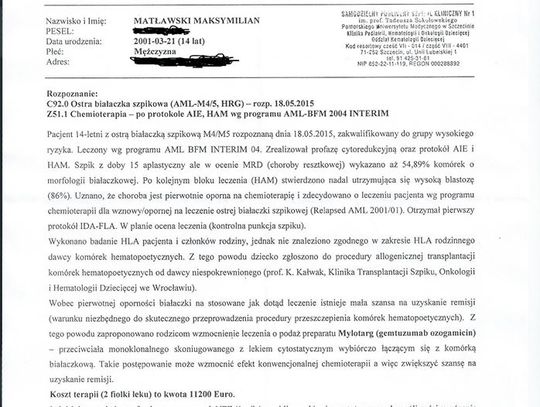 Zwracamy się z serdeczną prośbą o dofinansowanie zakupu leku Mylotarg, który może uratować życie naszego 14-letniego syna Maksymiliana Matławskiego, chorego na ostrą białaczkę szpikową. Wspomniany lek musi być zakupiony za granicą i nie jest on refundowany przez Narodowy Fundusz Zdrowia. Koszt terapii lekiem Mylotarg (dwie fiolki leku) to kwota 11.200 euro.