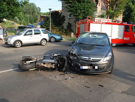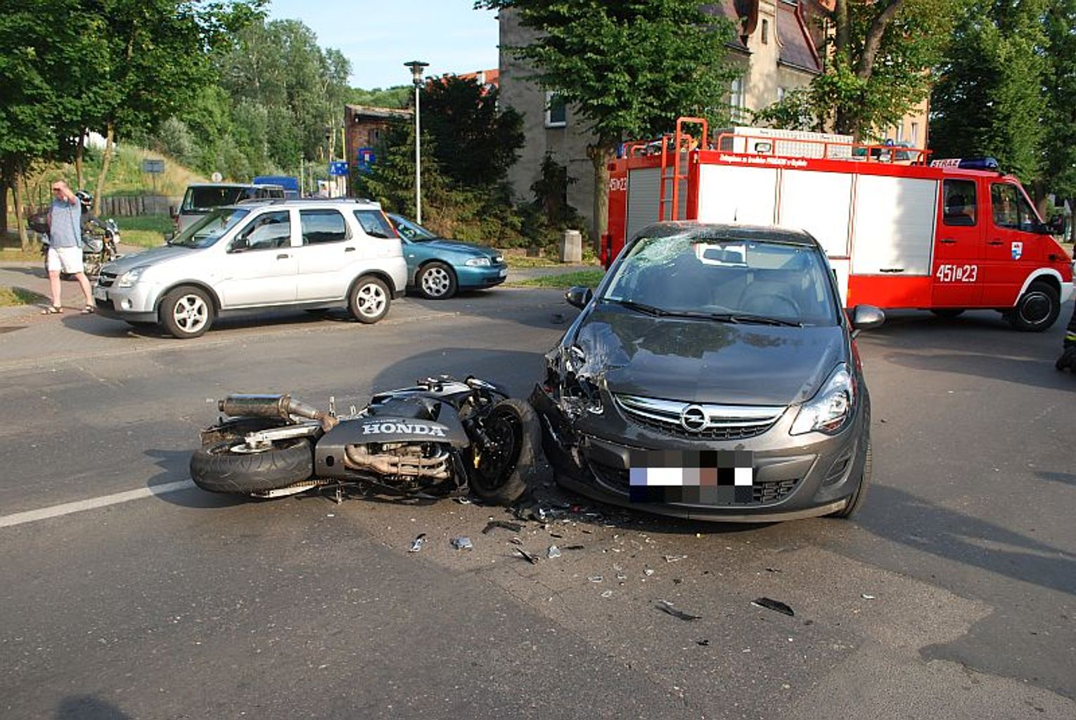 Motocykl marki Honda zderzył się z czołowo z oplem na ul. Łużyckiej w Gryfinie. Do wypadku doszło dzisiaj (16 lipca) ok. godz. 18. Rannego motocyklistę odwieziono do szpitala.