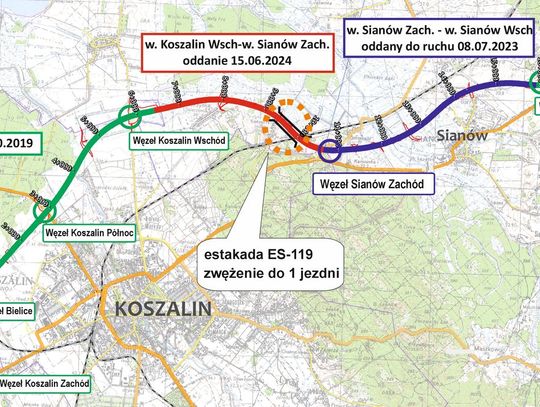 Ostatni blisko 5-kilometrowy fragment obwodnicy, od węzła Koszalin Wschód do węzła Sianów Zachód, został udostępniony kierowcom. Ruch odbywa się jeszcze ze zwężeniem do jednej jezdni na 800-metrowej estakadzie, a drugą nitkę udostępnimy w ciągu najbliższych kilku tygodni. Od dziś ruch tranzytowy w całości omija miasto.