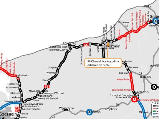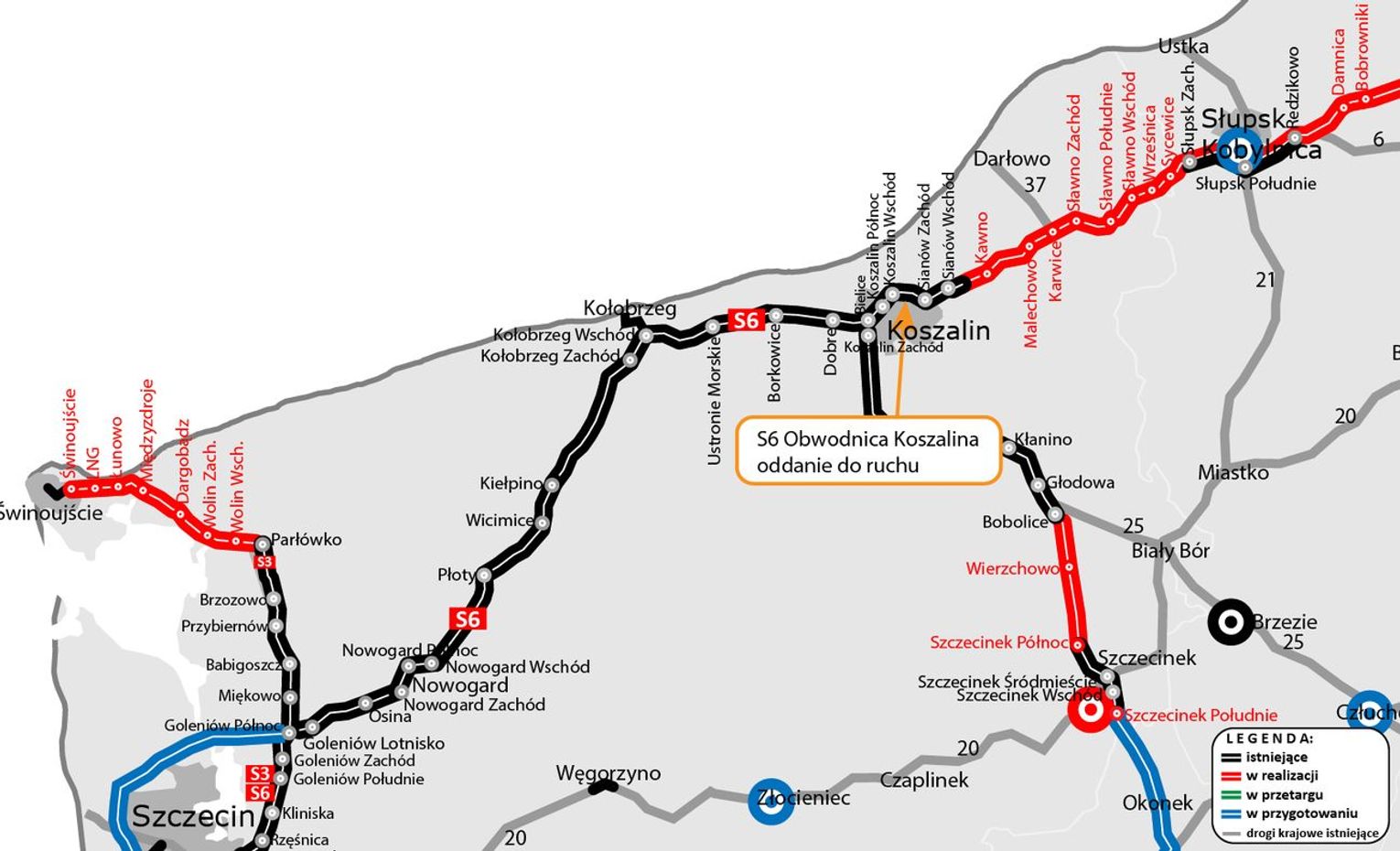 Cała obwodnica Koszalina i Sianowa, zrealizowana z dofinansowaniem z Funduszy UE w wysokości ok. 362 mln zł przy całkowitej wartości projektu ok. 1,3 mld zł, ma długość 20,2 km. Od 2019 roku funkcjonowały już odcinki o długości 12 km - od węzła Bielice do węzła Koszalin Wschód oraz węzeł Sianów Wschód. W lipcu ubiegłego roku została oddana do ruchu obwodnica Sianowa. Wraz z oddaniem ostatniego odcinka znacząco ułatwiono podróż kierowcom i zmniejszono uciążliwości dla mieszkańców miasta. Przejazd od węzła Bielice do węzła Sianów Zachód przez Koszalin zajmował około 20 minut, a w godzinach szczytu jeszcze dłużej. Teraz drogą S6 ominięcie Koszalina zajmie mniej niż 10 minut.