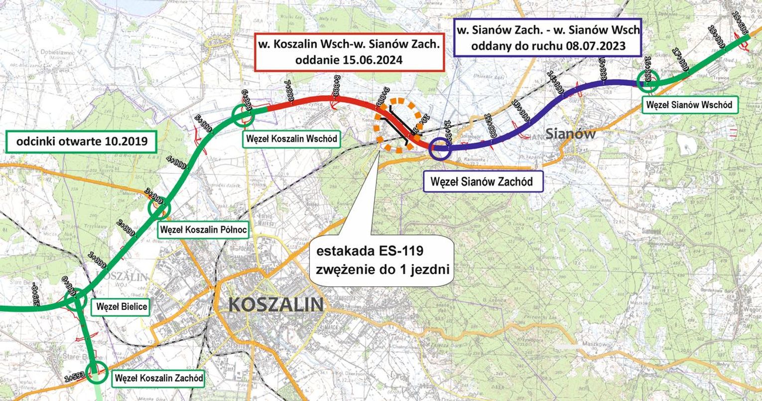 Po oddaniu do ruchu obwodnicy Koszalina droga S6 kończy się za Sianowem, ale realizacja S6 jest kontynuowana. W budowie są odcinki Sianów – Sławno i Sławno – Słupsk o łącznej długości 46 km. Trwają zarówno prace drogowe, jak i mostowe, rozpoczęło się wykonywanie podbudów bitumicznych. W wielu miejscach zostały wprowadzone tymczasowe organizacje ruchu i kierowcy muszą liczyć się z utrudnieniami. Zakończenie prac planowane jest w drugiej połowie przyszłego roku. Trwa również budowa odcinków S6 w województwie pomorskim. Powstaje tu druga jezdnia obwodnicy Słupska oraz cztery odcinki realizacyjne od Słupska do trasy kaszubskiej. Całość połączenia S6 do Gdańska ma być gotowa w I połowie 2026 roku.