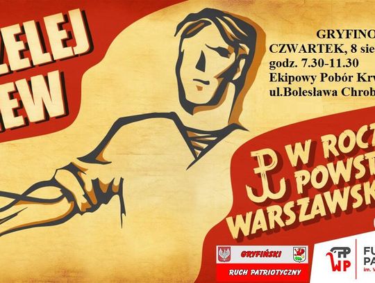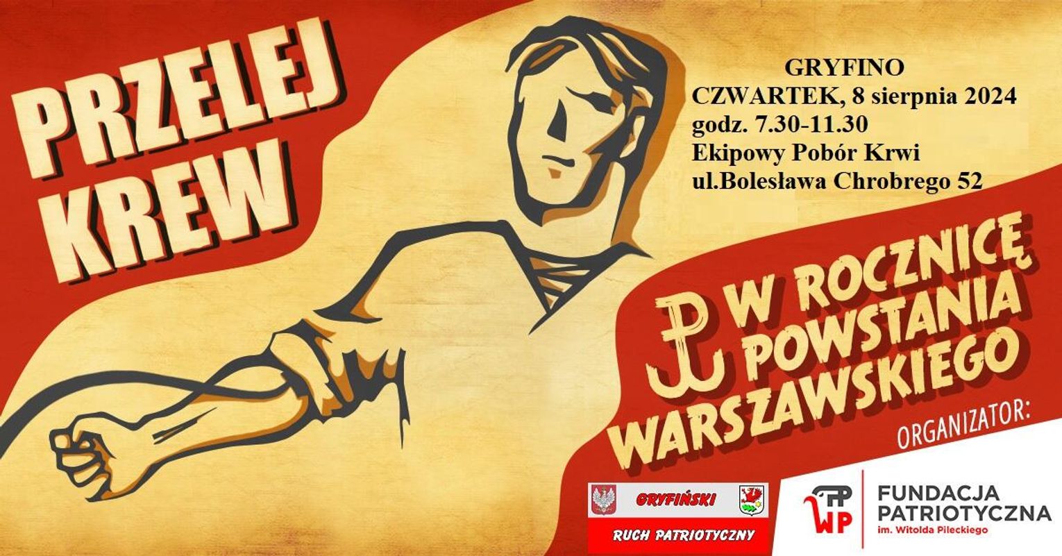 W związku z 80. rocznicą Wybuchu Powstania Warszawskiego, Fundacja Patriotyczna im. Witolda Pileckiego oraz Stowarzyszenie Gryfiński Ruch Patriotyczny organizują 8 sierpnia 2024 r. w Gryfinie akcję "Przelej krew w rocznicę Powstania Warszawskiego".