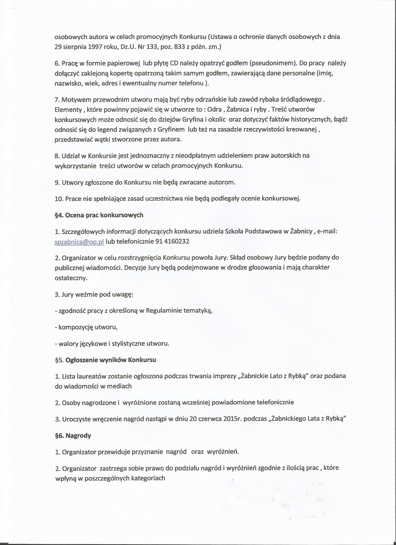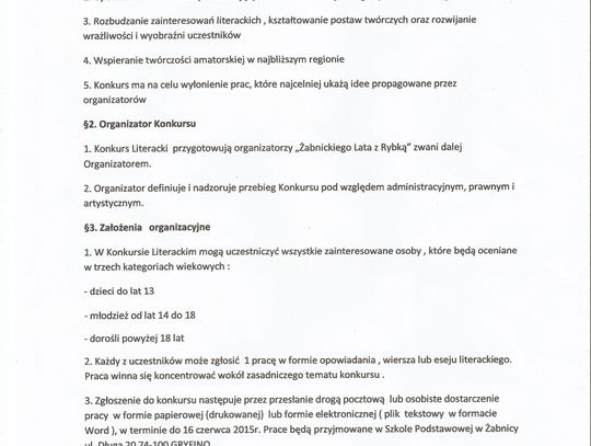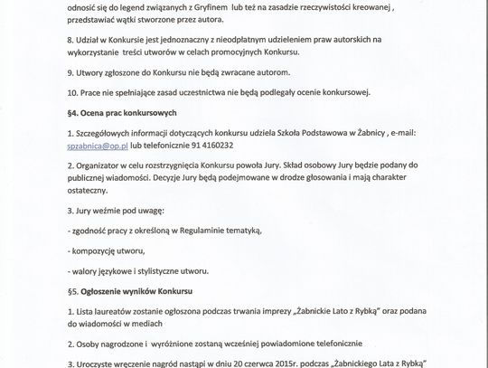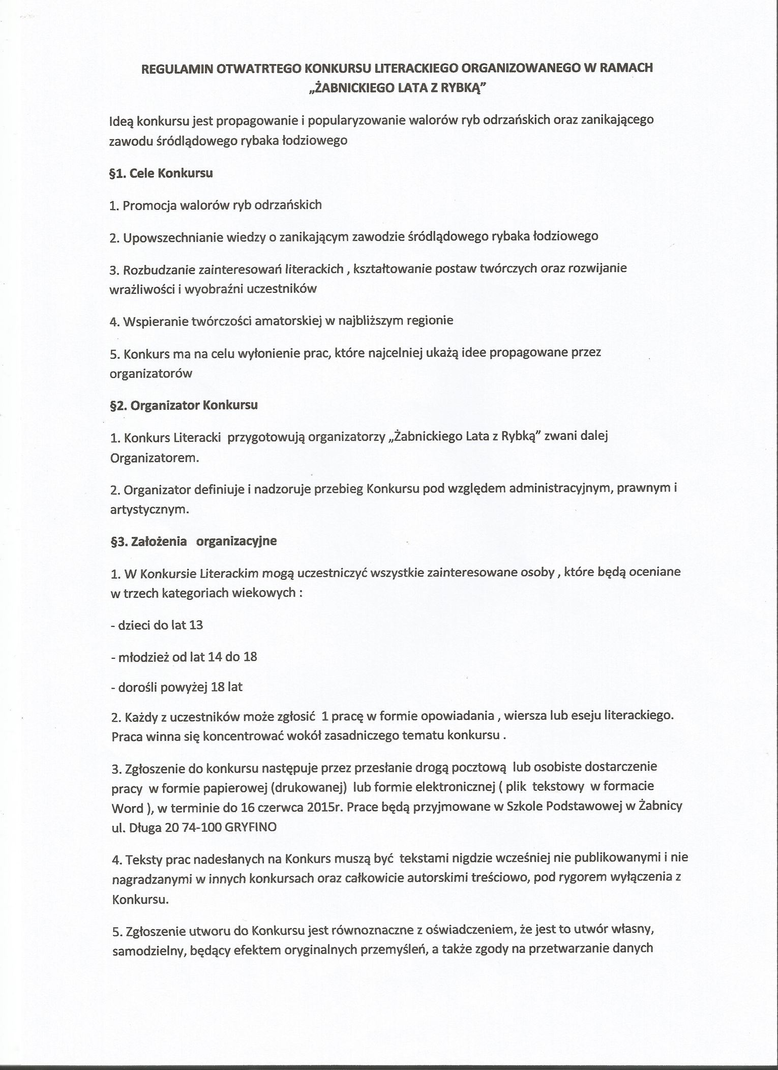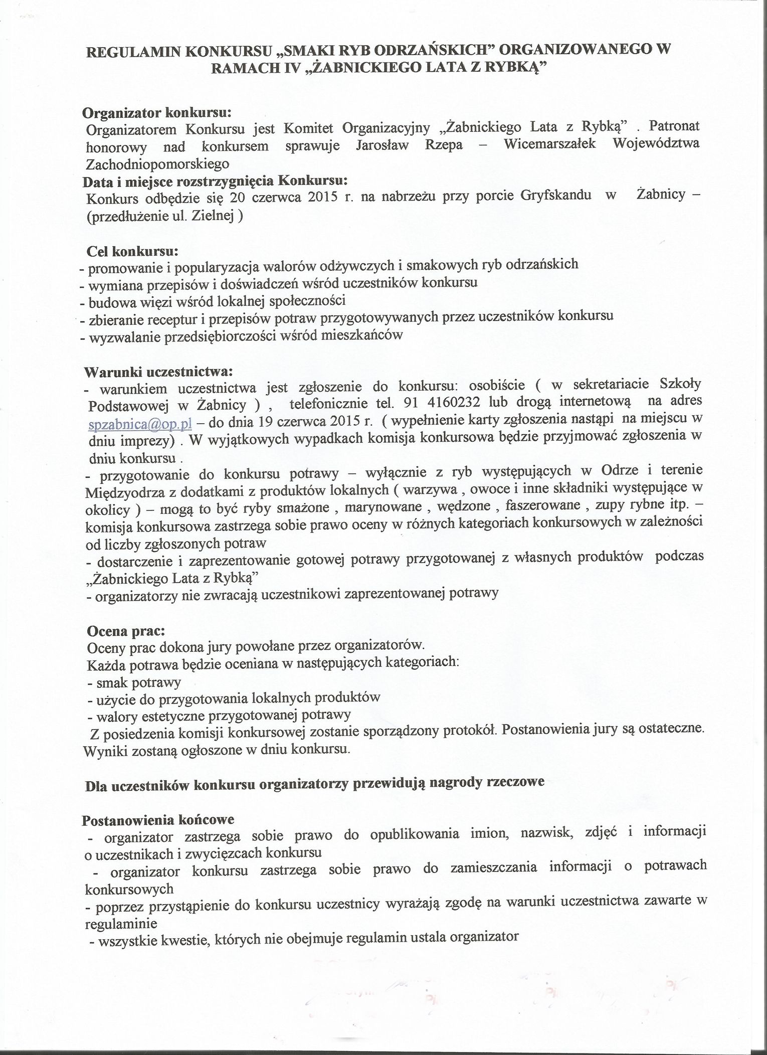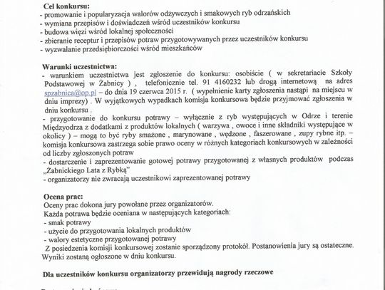 W imieniu organizatorów zapraszamy do wzięcia udziału w Regionalnym Konkursie „Smaki ryb odrzańskich”. Dla tych, którzy lepiej czują się w ucztach duchowych niż kulinarnych, przygotowano konkurs literacki, którego motywem przewodnim mają być Odra, Żabnica i zawód rybaka.
