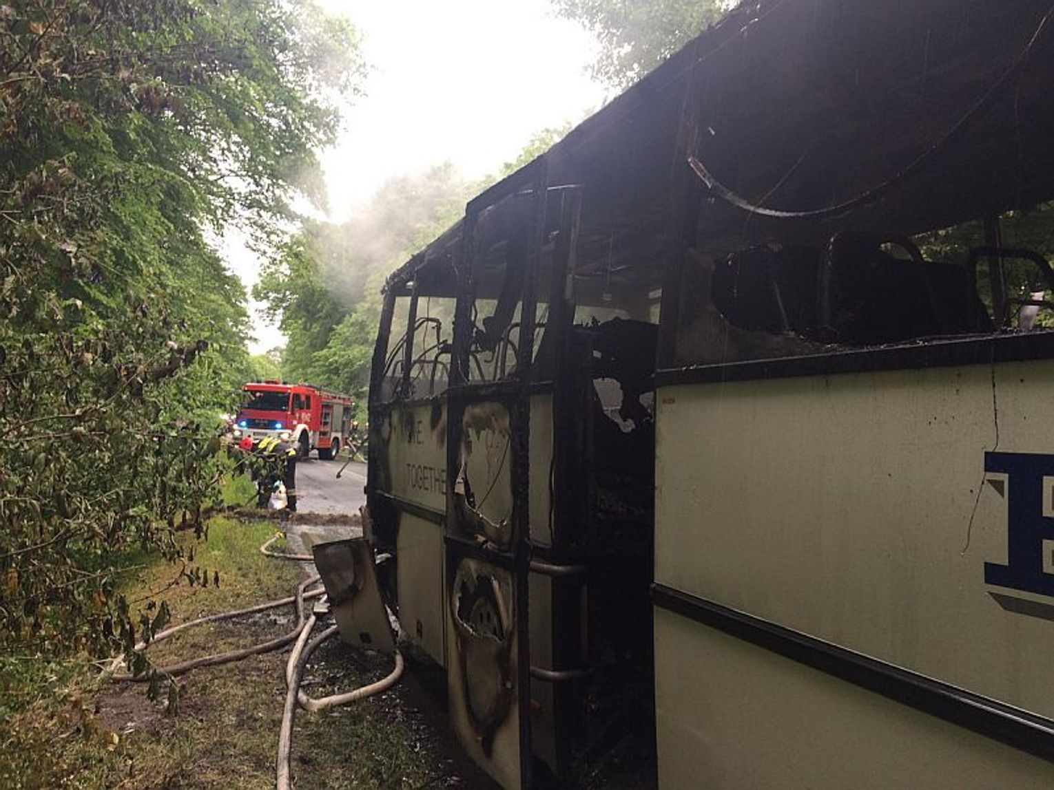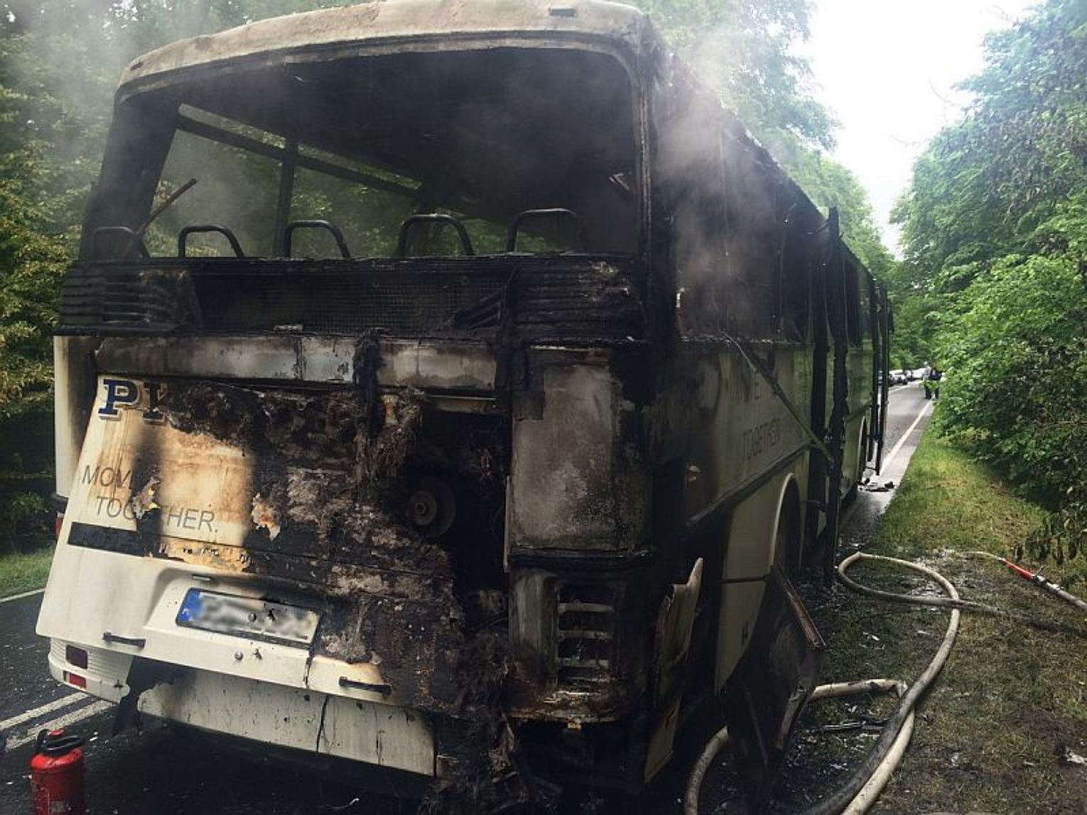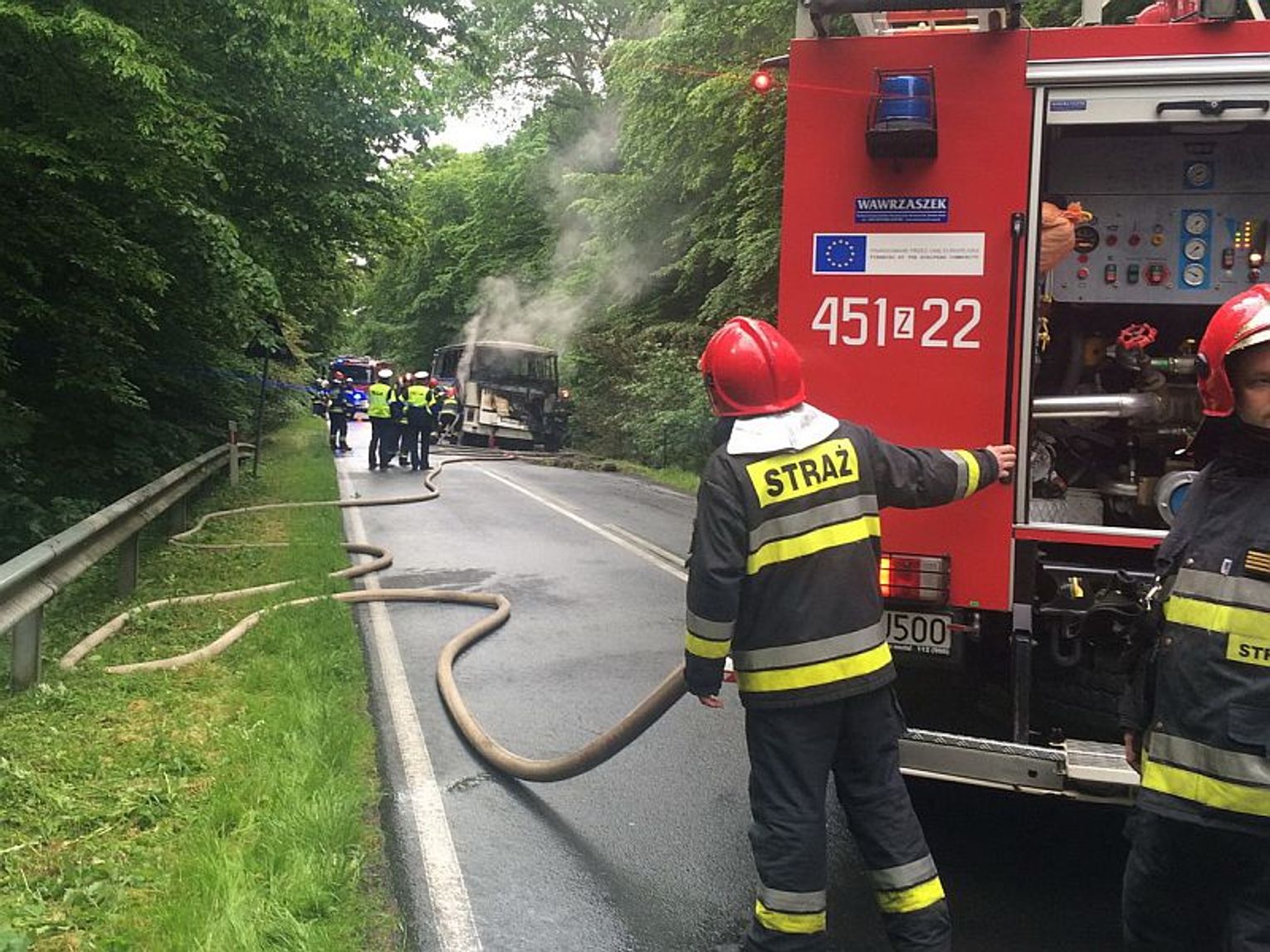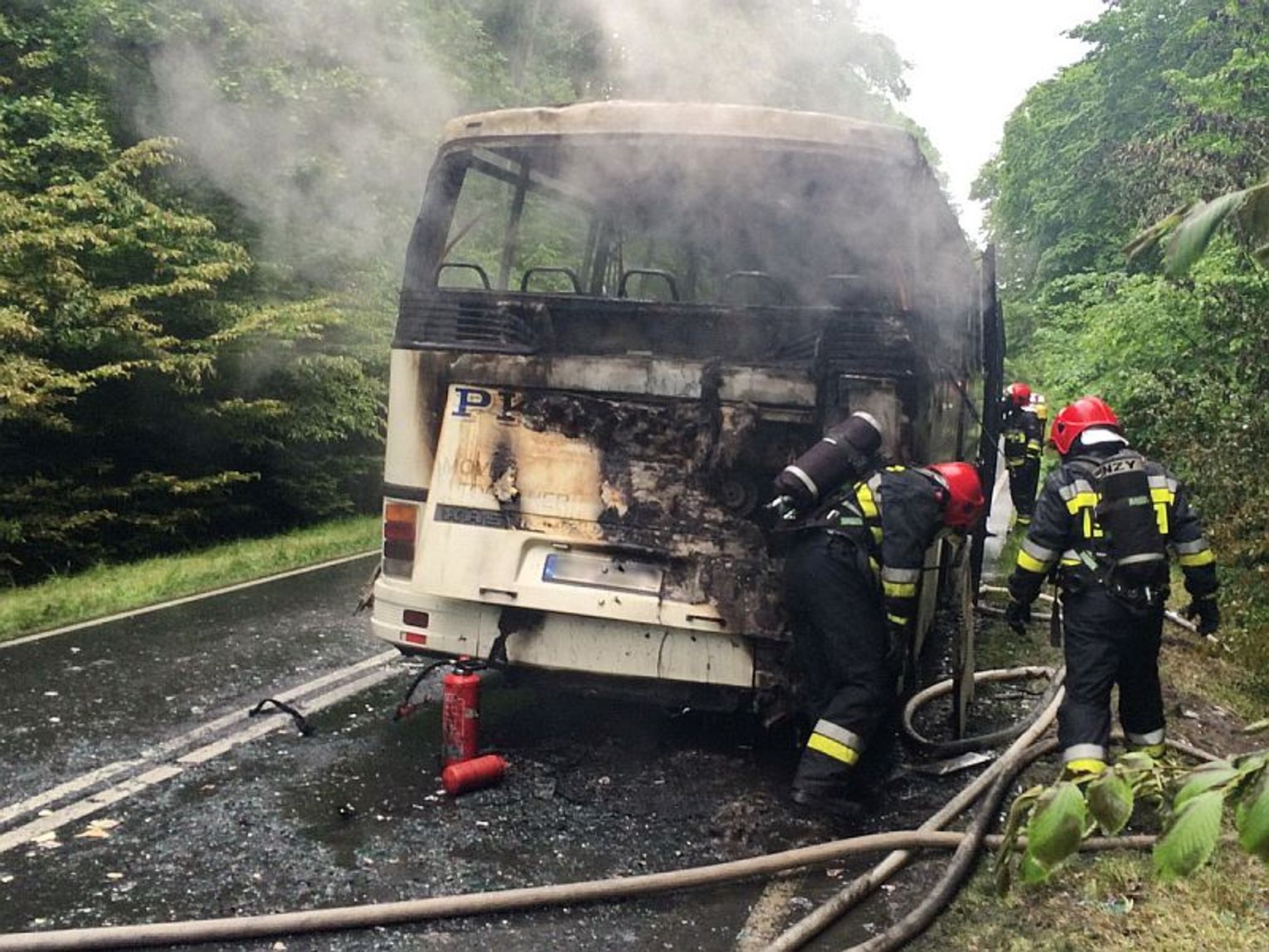 - Działania strażaków polegały na zabezpieczeniu miejsca zdarzenia, podaniu dwóch prądów wody w natarciu na palącą się komorę silnika i przedział pasażerski. Odłączono klemy akumulatora. Działania prowadzono w aparatach OUO. Kierowca autobusu został zabrany do szpitala przez ZPRM. Na czas prowadzenia działań droga została zamknięta dla ruchu przez policję. Z drogi usunięto rozlane płyny eksploatacyjne przy użyciu neutralizatora oraz podręcznego sprzętu burzącego – relacjonuje strażak z Komendy Powiatowej Państwowej straży Pożarnej w Gryfinie.