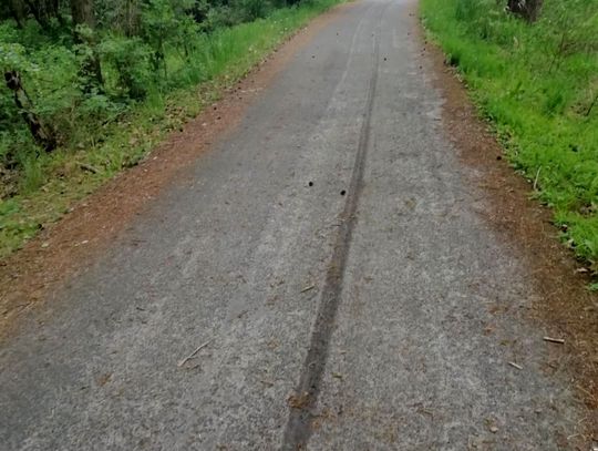 Zniszczone auto znajduje się na starej ścieżce rowerowej przy wyjeździe z lasu niedaleko Wełtynia. Zdjęcia otrzymaliśmy od czytelniczki.