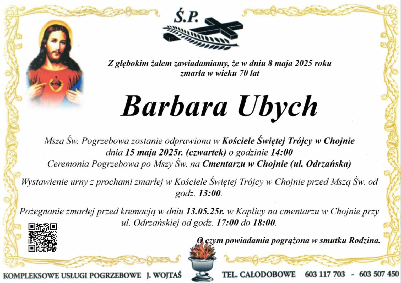 Msza św. żałobna odprawiona zostanie 15 maja 2025 r. o godz. 14 w kościele pw. Św. Trójcy w Chojnie.
