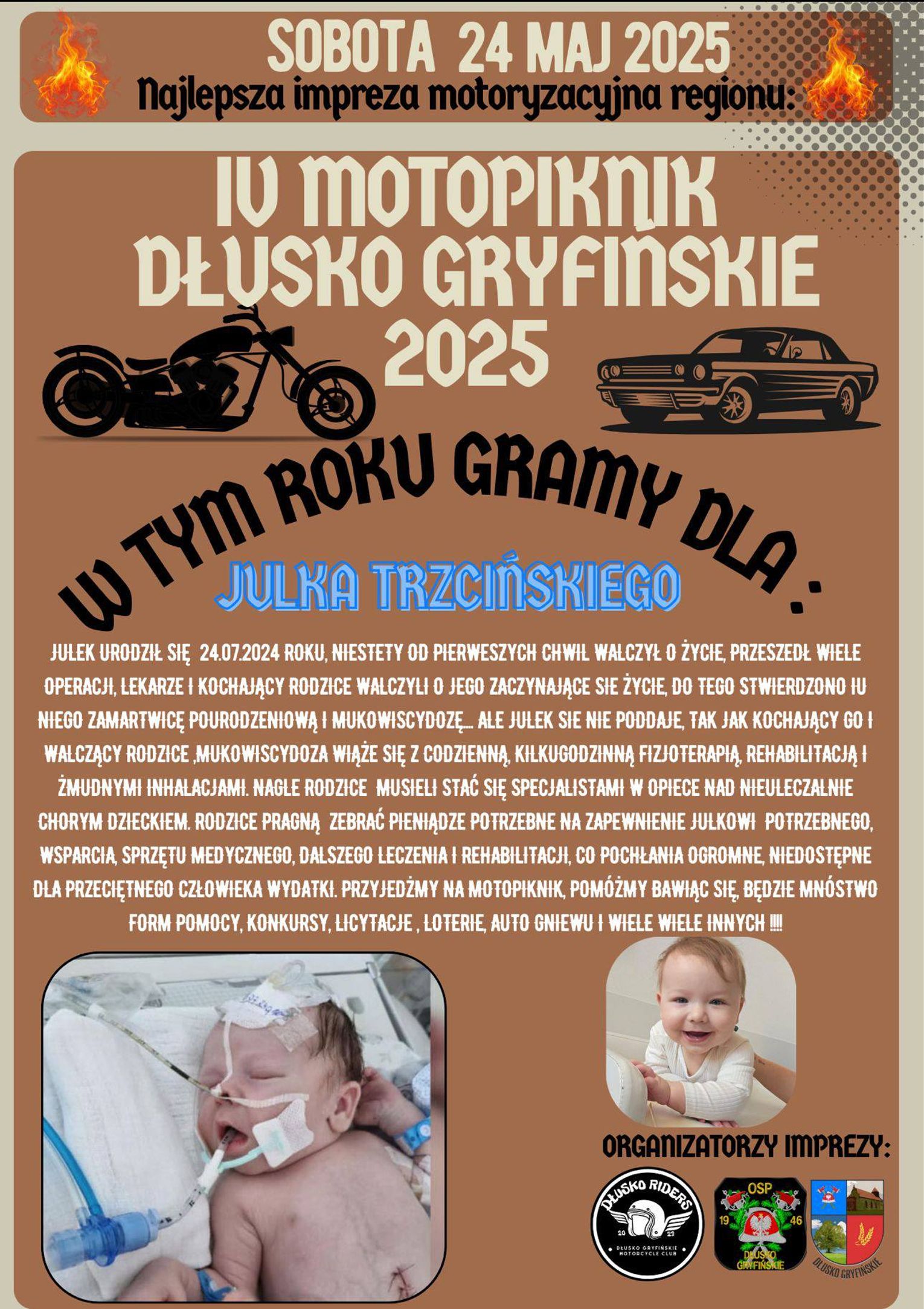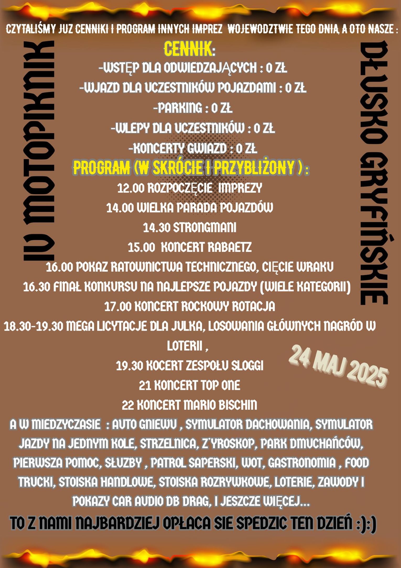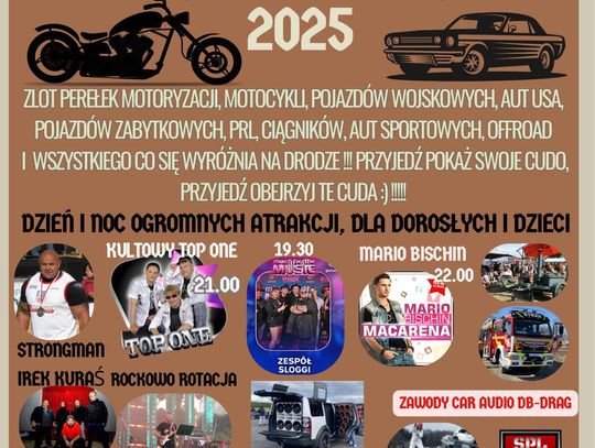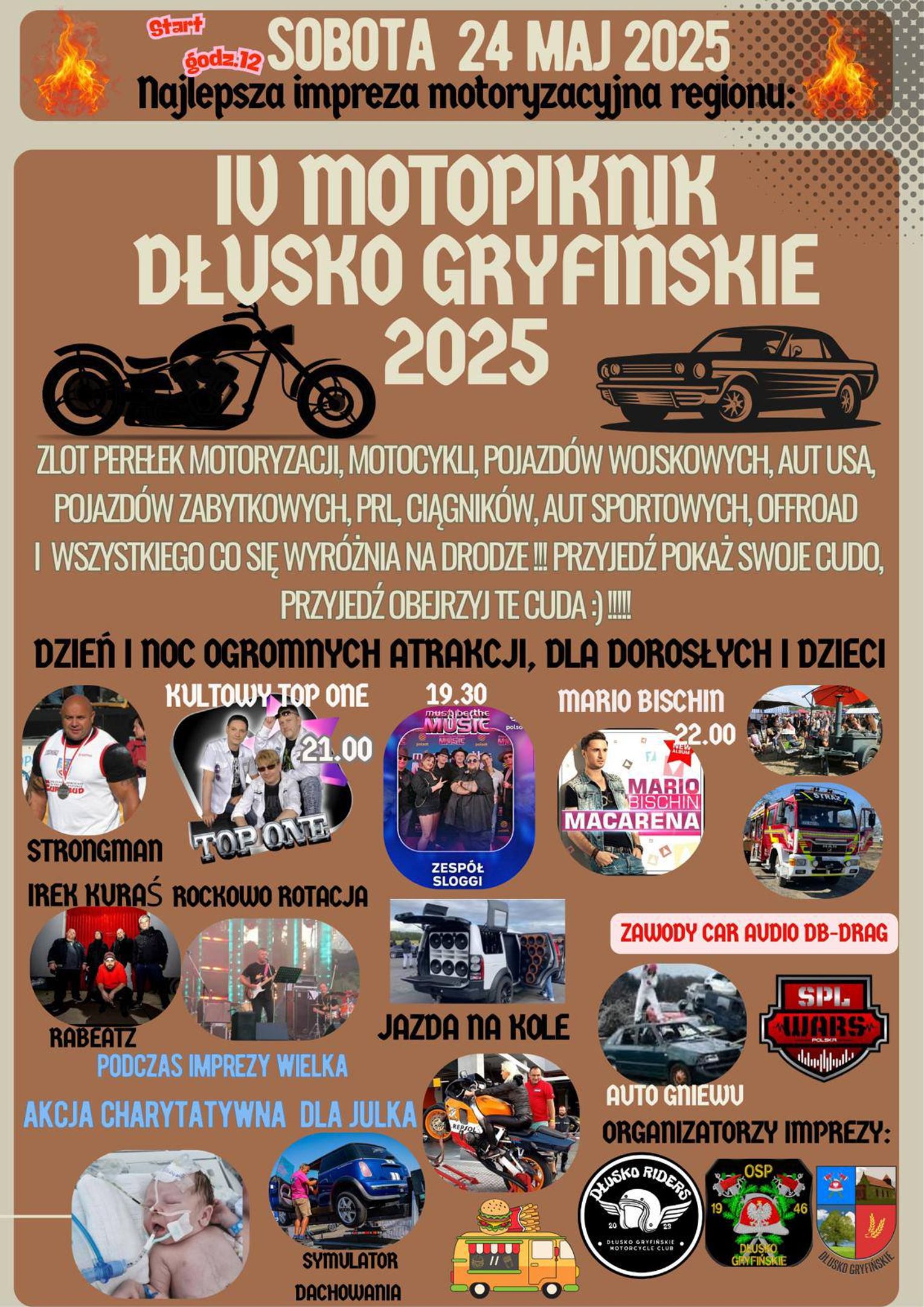 Dłusko zaprasza wszystkich właścicieli motocykli, pojazdów klasycznych, aut USA, każdego nietuzinkowego wodzidła. Pokażcie je tłumom widzów chcących oglądać Wasze cuda. To zlot inny niż wszystkie. Tu nie liczy się komercja, tu liczy się mnogość atrakcji, nad którymi pracowaliśmy od ponad pół roku. I co bardzo ważne - dzięki tej megazabawie można pomóc choremu małemu Julkowi Trzcińskiemu. Podczas akcji charytatywnej będzie można skorzystać z loterii, licytacji i mnóstwa innych form pomocy. Gwarantujemy - u nas nudzić się nikt nie będzie. Głodny też nikt nie będzie - lokalna gastronomia i foodtrucki napełnią Wasze żołądki do syta. A Biały Miś rozkołysze wszystkich najedzonych i cofnie do pięknych lat 90. Top One wpisze się idealnie w retroklimat, a Mario Bischin przywróci nas do teraźniejszości.