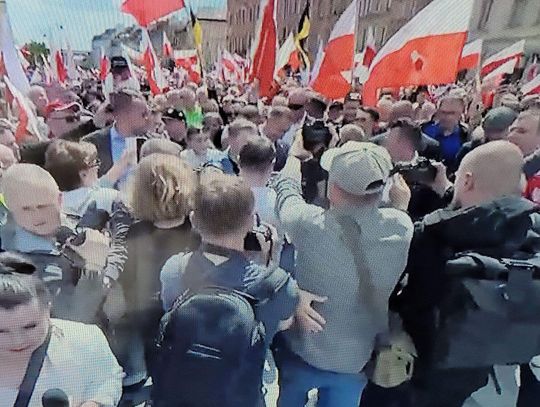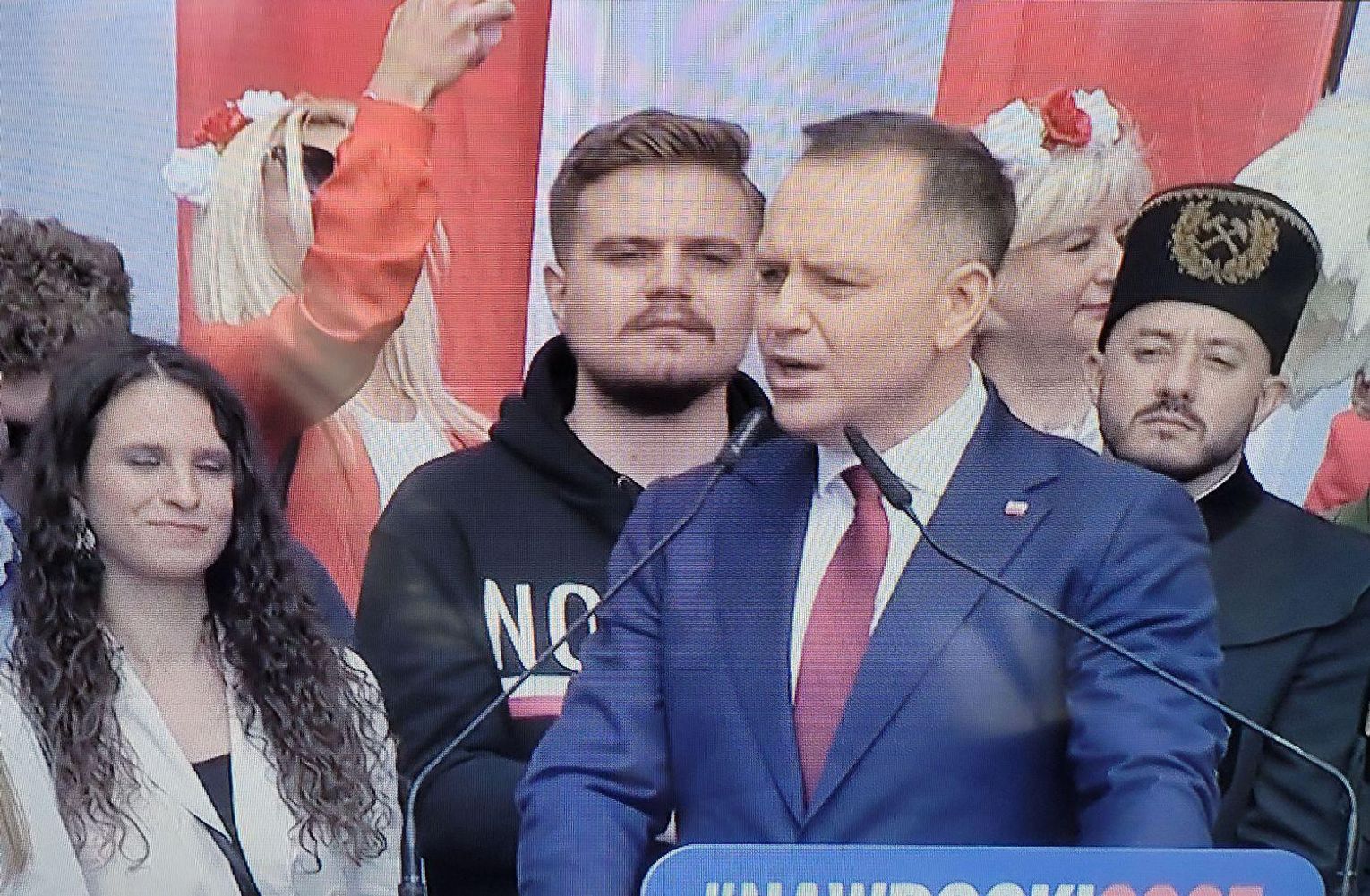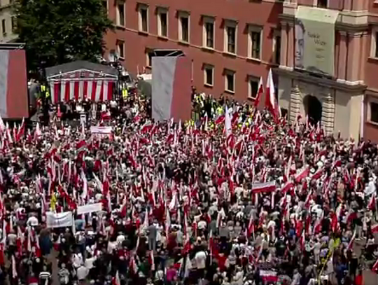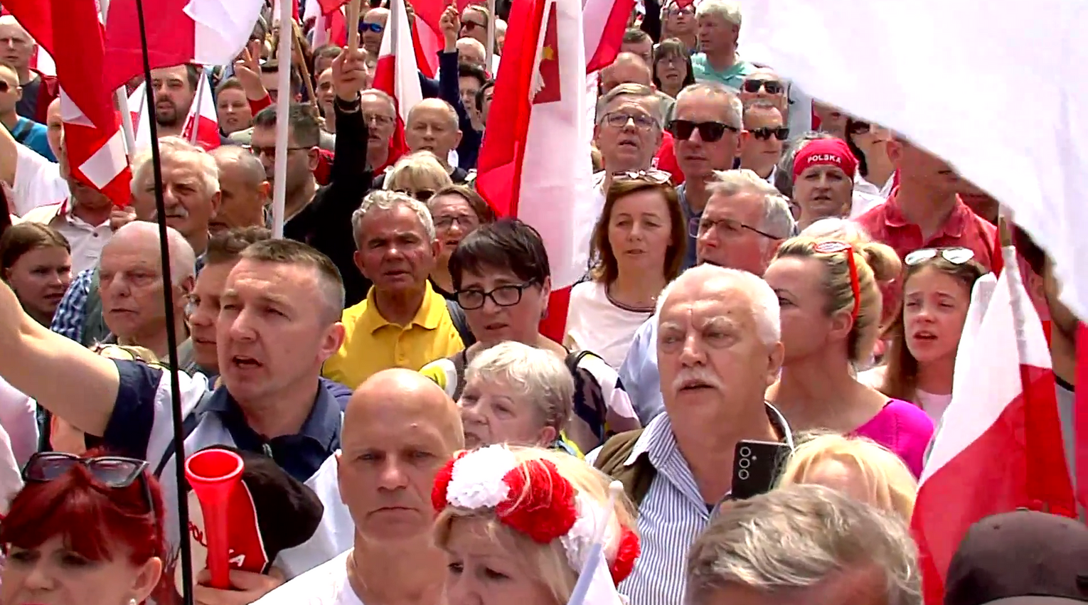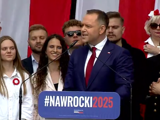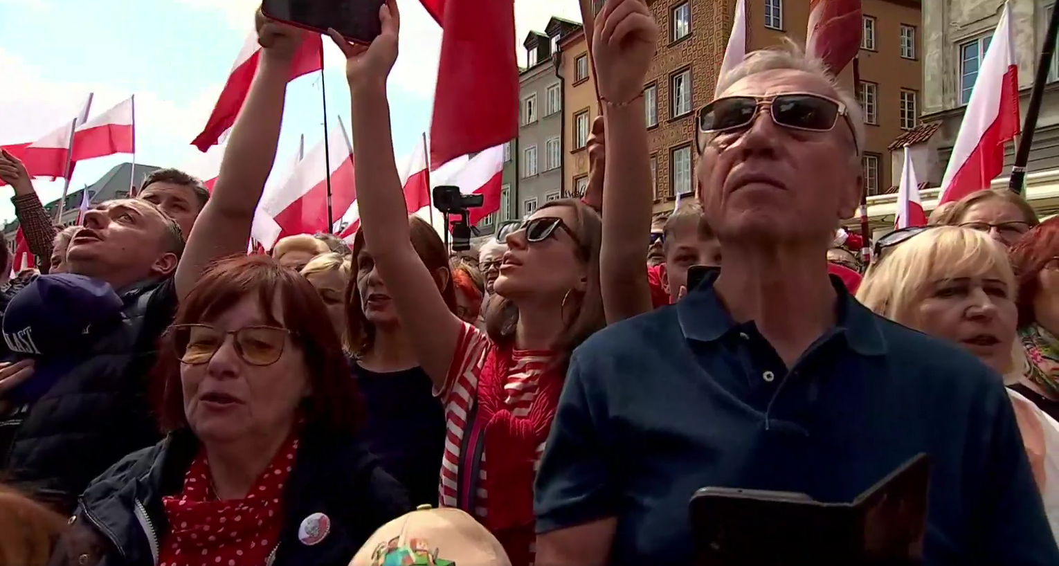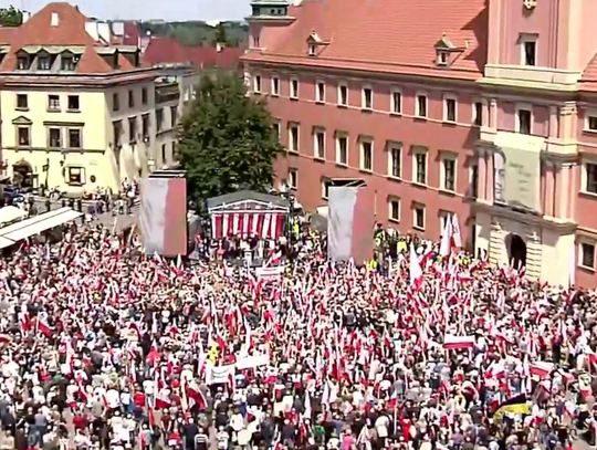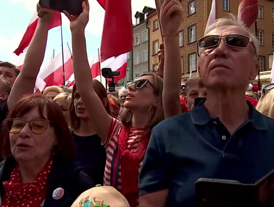 Zwolennicy kandydata popieranego przez Prawo i Sprawiedliwość mieli ze sobą flagi i transparenty, skandowali "Bóg, honor i ojczyzna" "Karol Nawrocki prezydentem Polski" i śpiewali religijne pieśni.