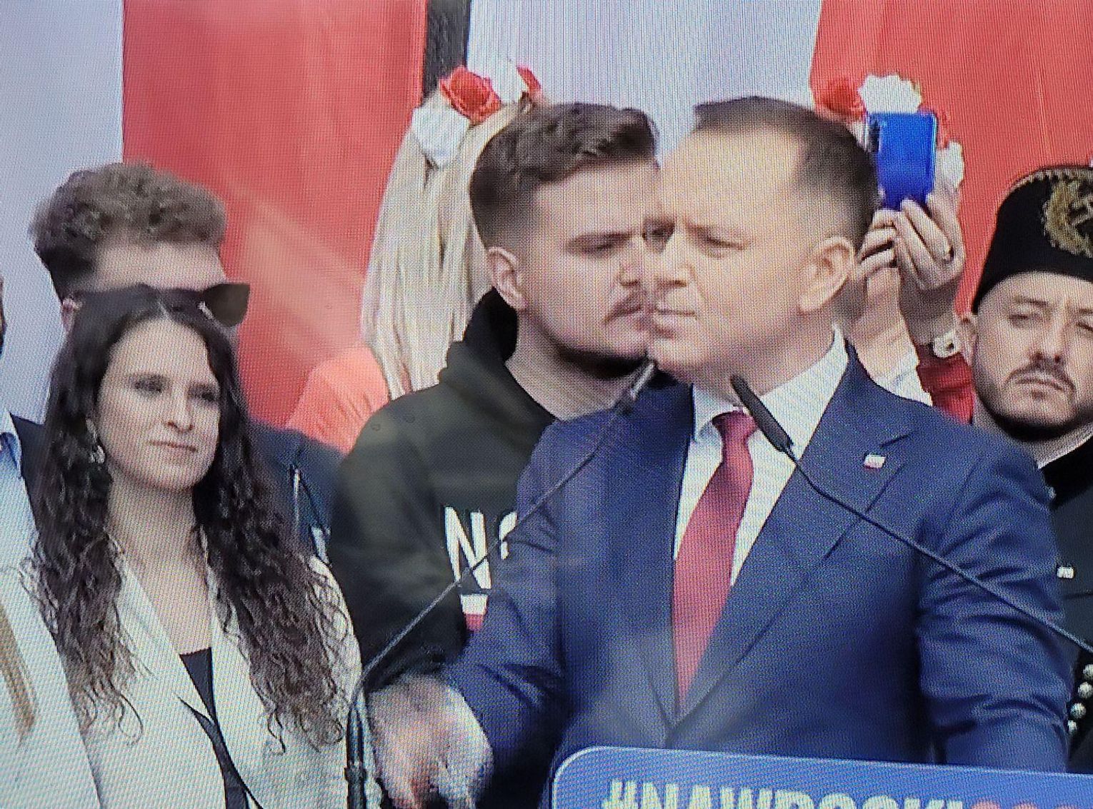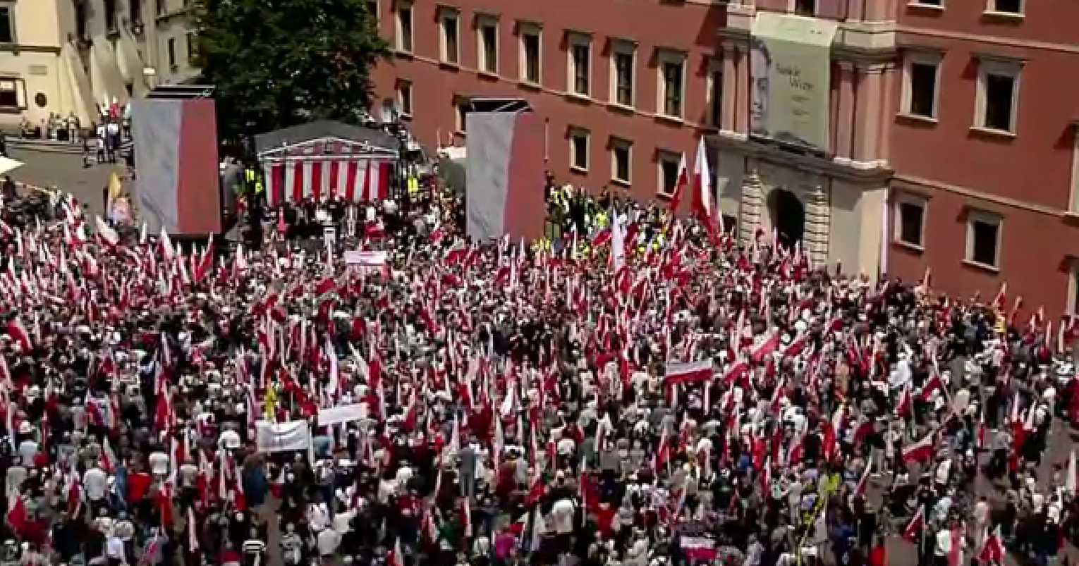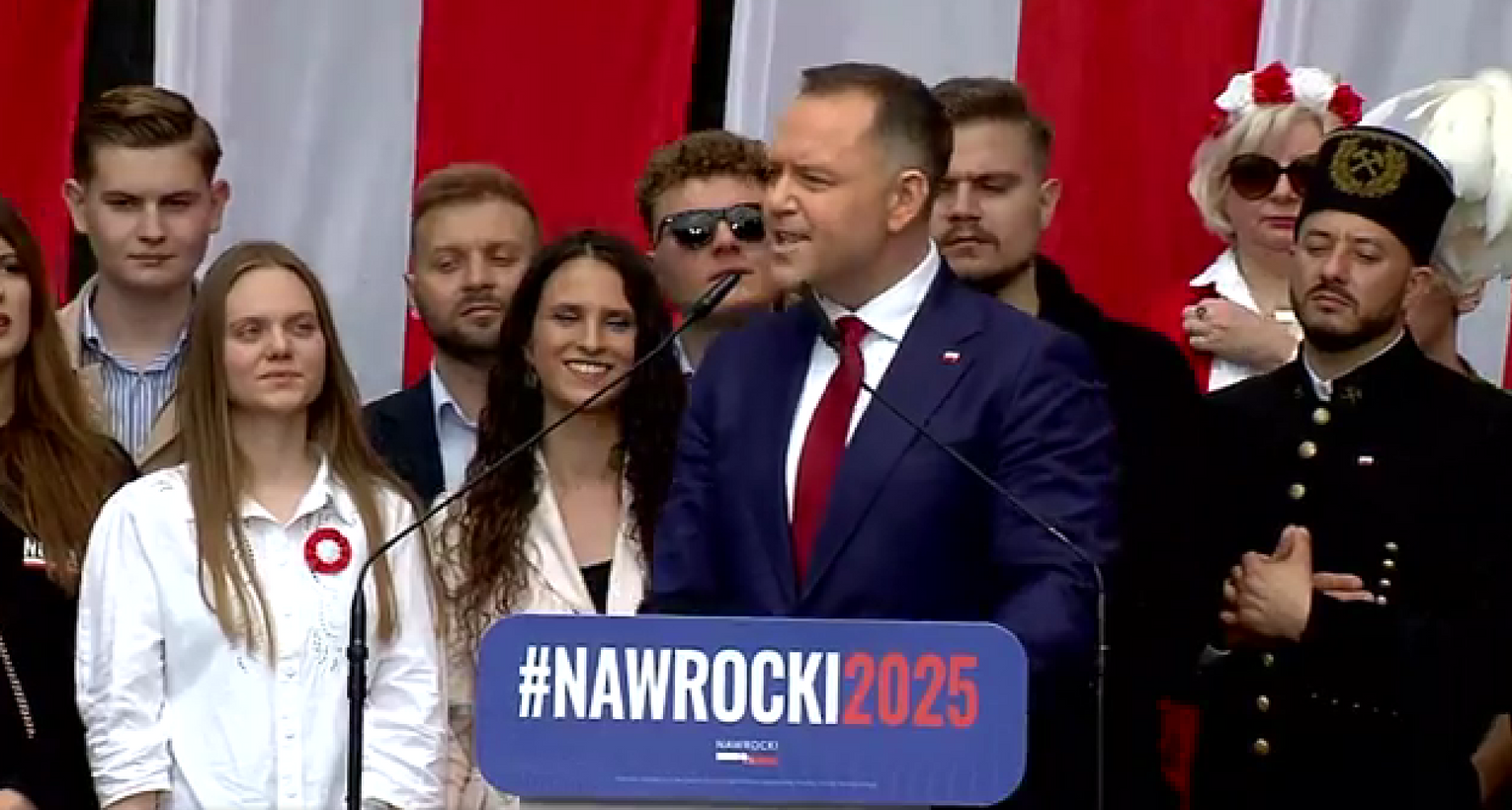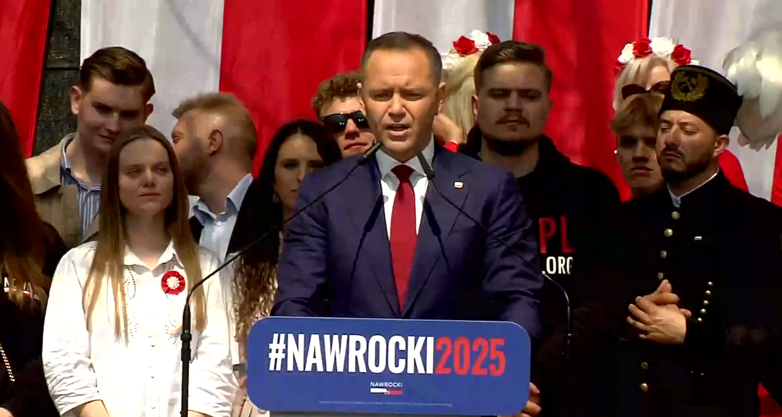 Zwolennicy kandydata popieranego przez Prawo i Sprawiedliwość mieli ze sobą flagi i transparenty, skandowali "Bóg, honor i ojczyzna" "Karol Nawrocki prezydentem Polski" i śpiewali religijne pieśni.