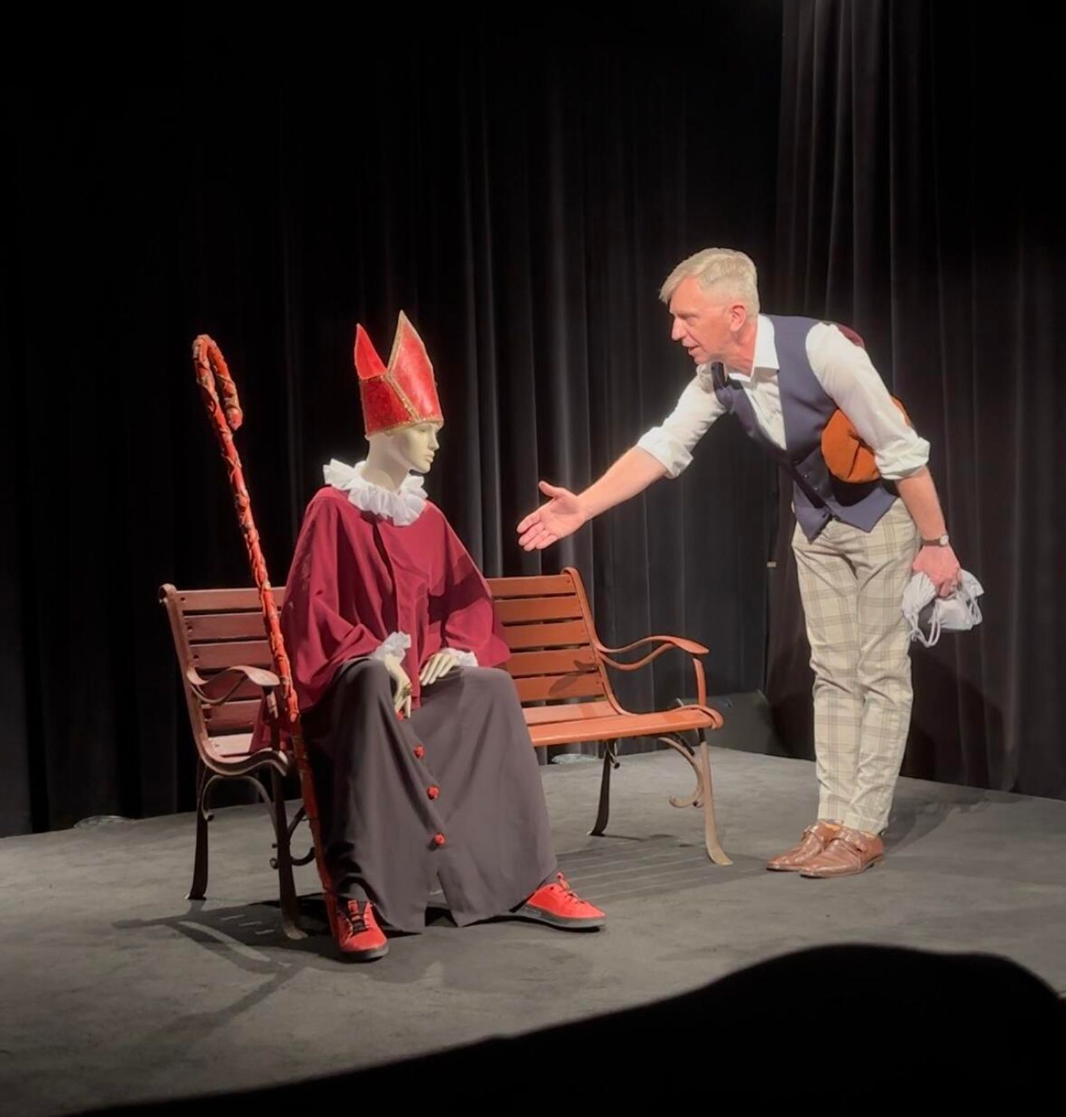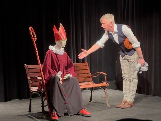 6-Artur Smogór w trakcie prezentacji w Zamku Książąt Pomorskich w Szczecinie nagrodzonego monodramu pt. „Nowe po staremu, czyli stare po nowemu” na podstawie jednoaktówki Sławomira Mrożka „Lis filozof”; scenariusz i reżyseria: Maria Piznal