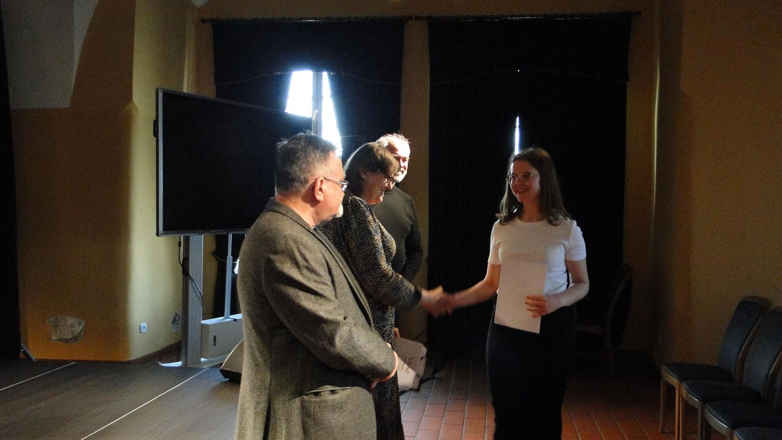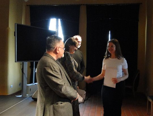 5-Maja Przybysz odbiera gratulacje dla najlepszej recytatorki w kat. „młodzież szkół ponadpodstawowych”, podczas eliminacji miejskich w Zamku Książąt Pomorskich w Szczecinie
