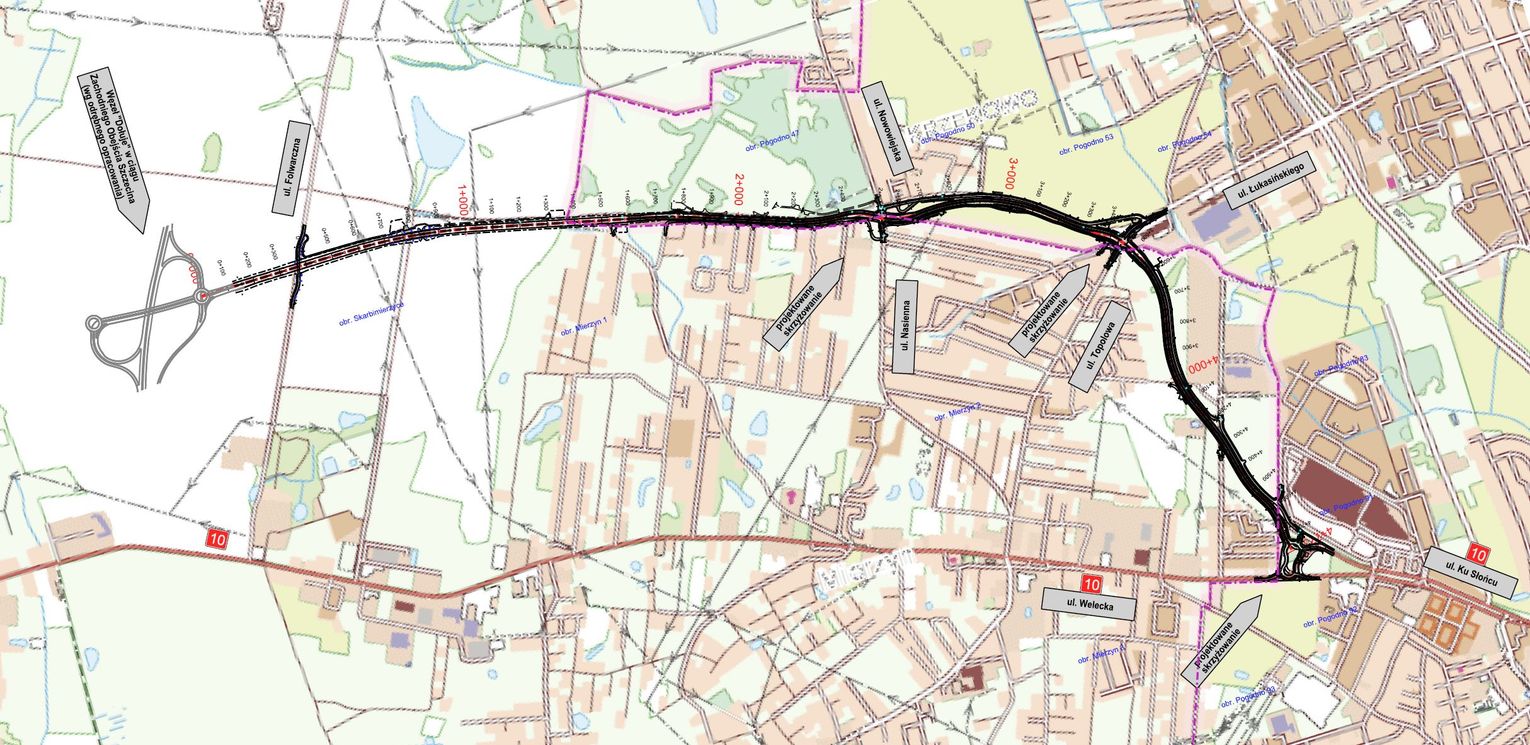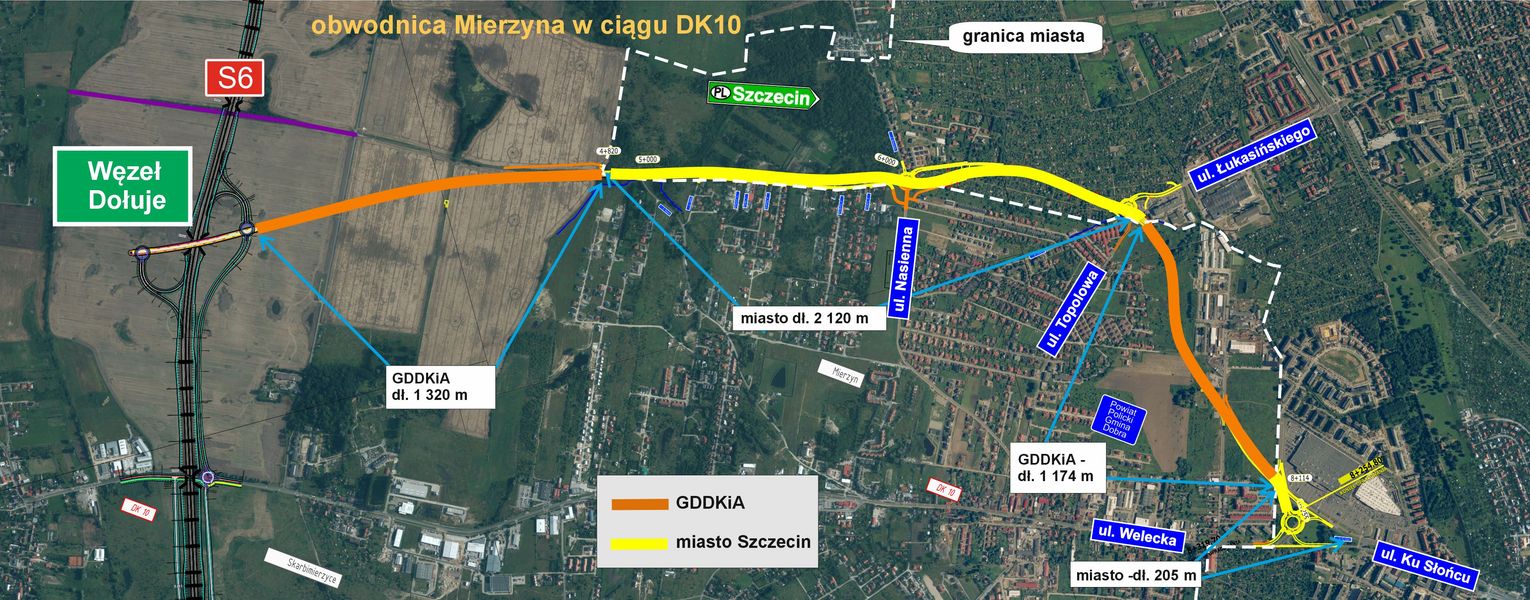 Początkiem drogi od strony Szczecina będzie skrzyżowanie na końcu ulicy Ku Słońcu w rejonie istniejącego centrum handlowego. Ten początkowy fragment, o długości ponad 200 m, to teren Miasta Szczecin. Dalej trasa będzie biegła w kierunku północnym, do połączenia ulic Topolowej i Łukasińskiego. Za ten odcinek o długości ok. 1,2 km będzie odpowiedzialna GDDKiA. Dalej trasa ponownie wejdzie na teren Szczecina i będzie biegła w kierunku zachodnim, przechodząc częściowo przez teren ogródków działkowych. Po ok. 2,1 km droga opuści teren miasta. Dalej nowa DK10 po pokonaniu ok. 1,3 km dotrze do węzła Szczecin Zachód (Dołuje). Za ten ostatni fragment również odpowiada GDDKiA.