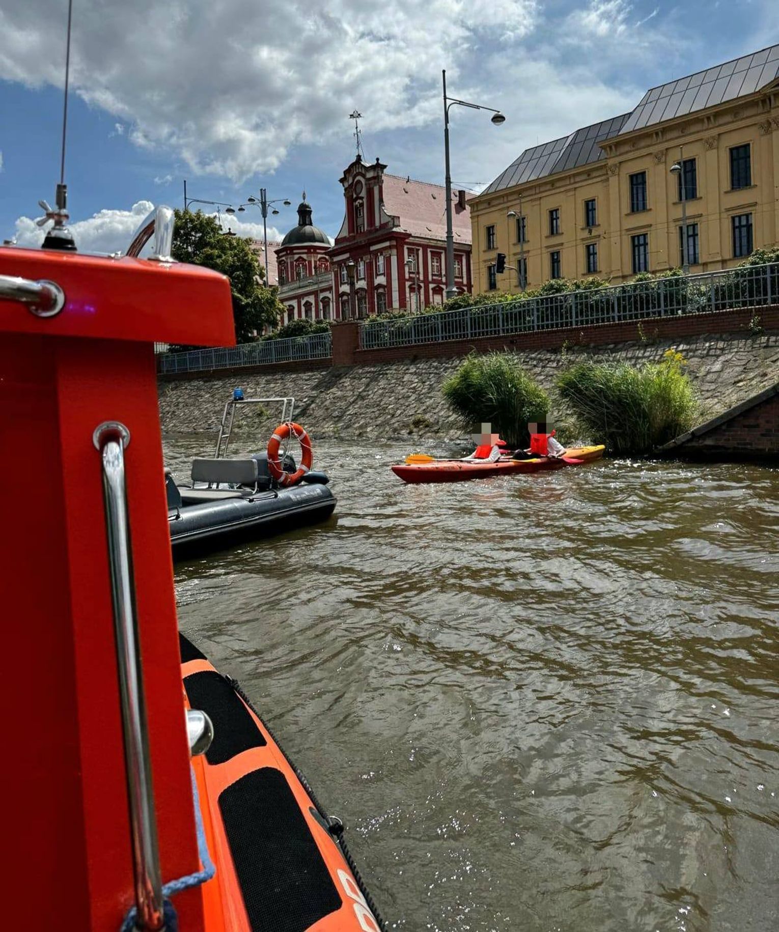 Niemal w tym samym czasie, na numer alarmowy WOPR wpłynęło zgłoszenie o kajaku pływającym przy Wyspie Słodowej w centrum Wrocławia na odcinku Odry objętym zakazem.
