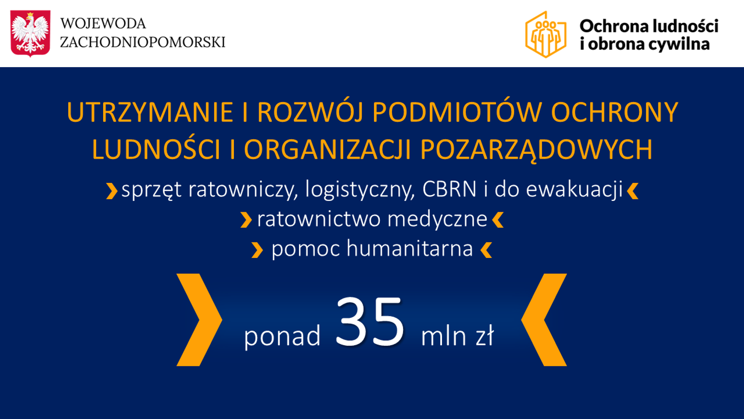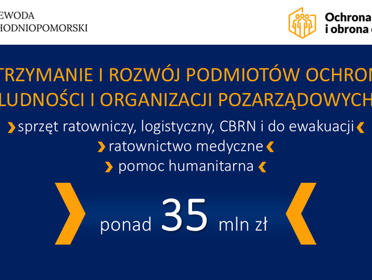 Kolejnym obszarem jest utrzymanie i rozwój podmiotów ochrony ludności i organizacji pozarządowych. Na zakup sprzętu ratowniczego do ewakuacji, wsparcie ratownictwa medycznego i organizację pomocy humanitarnej przeznaczono ponad 35 mln zł. Te zadania będzie realizowała Państwowa Straż Pożarna.