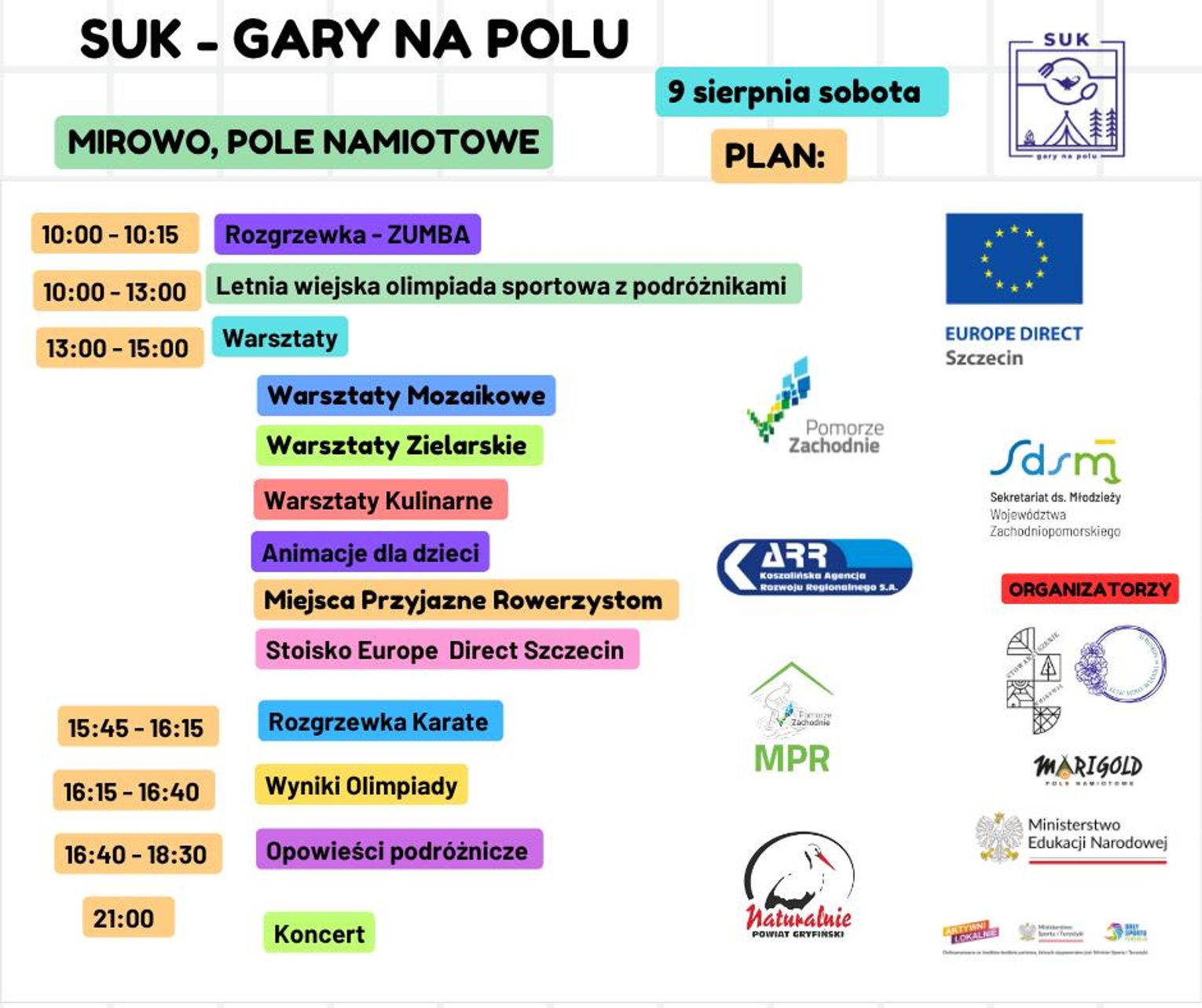 Organizatorzy zapraszają na wyjątkowe wydarzenie na polu namiotowym w Mirowie, które już trwa, zaplanowany został między 8 a 10 sierpnia 2025 r.! Sukcesywny, atrakcyjny i edukacyjny i rekreacyjny festiwal pod nazwą SUK - Gary na Polu, zaprasza całe rodziny na trzydniową przygodę pełną edukacyjnych i integracyjnych atrakcji.