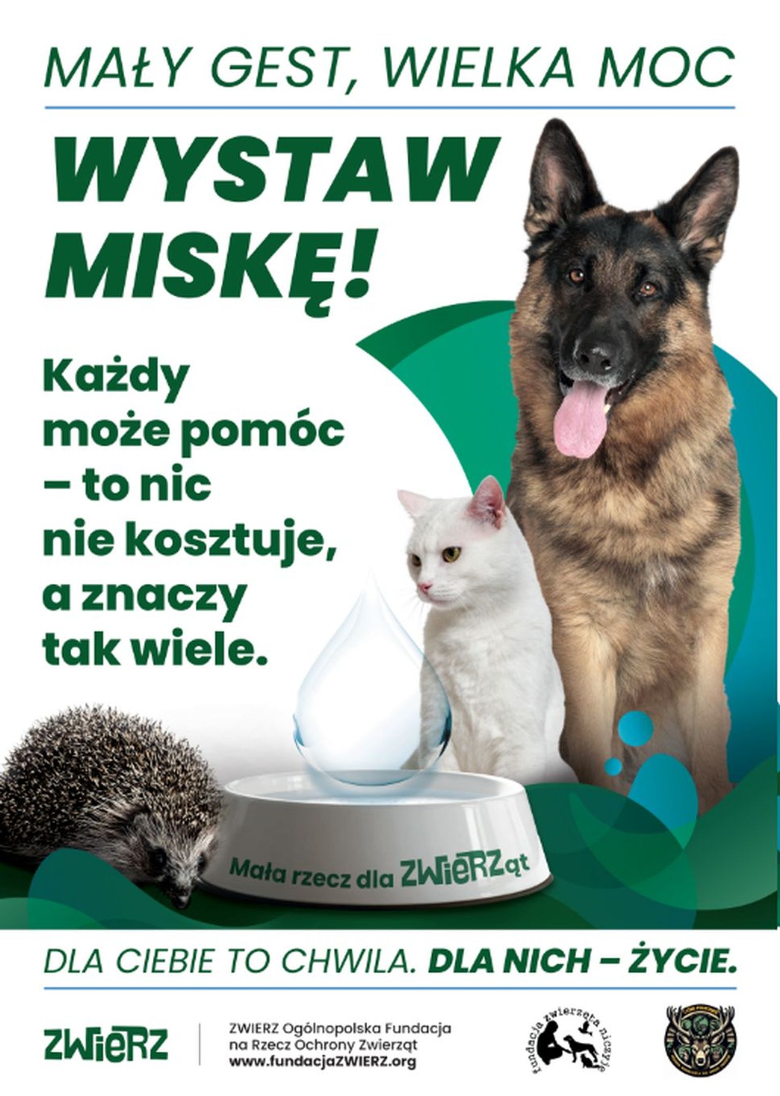 Kampania koncentruje się na prostym, lecz niezwykle ważnym geście – wystawieniu miski z wodą dla zwierząt, które w wysokich temperaturach szczególnie potrzebują stałego dostępu do wody. Podkreślamy, że ten niewielki gest może uratować życie wielu zwierzętom, zarówno domowym, jak i wolno żyjącym.