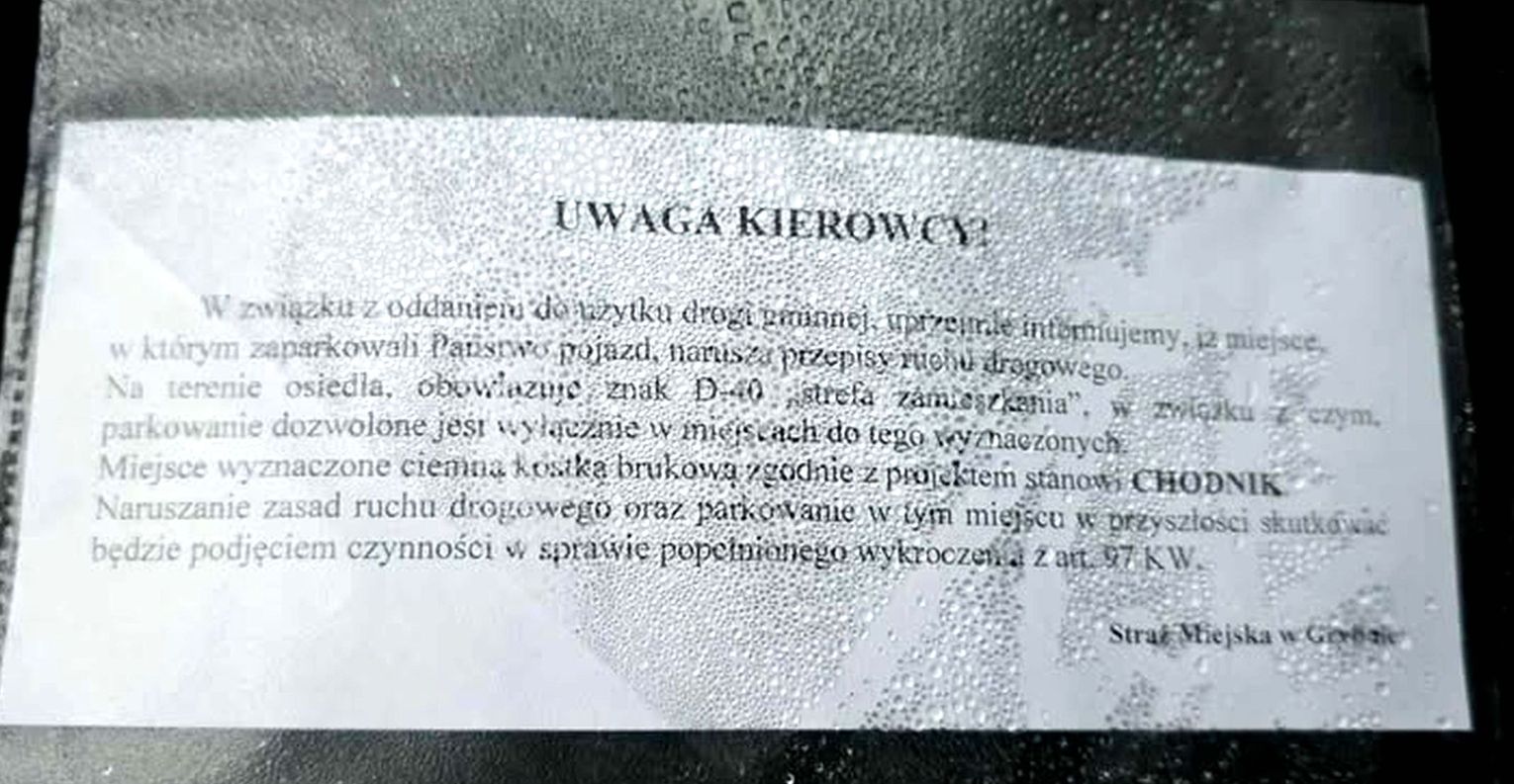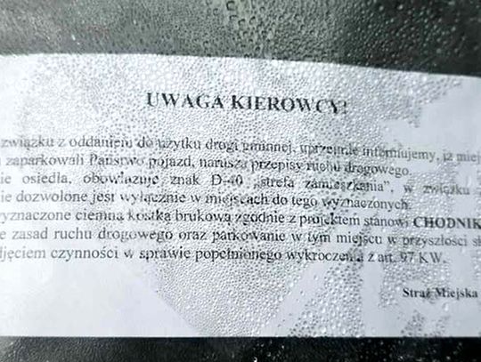Kilka dni temu w nocy straż miejsca za szyby każdego z aut wsadziła karteczki o tym, że łamiemy przepisy i będzie skutkować to mandatem..