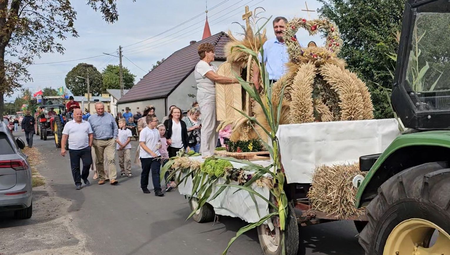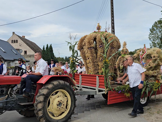 Uczestnicy korowodu szli za pięknymi dożynkowymi wieńcami, które głównie transportowano na przyczepach ciągników. Przy okazji trzeba wspomnieć, że maszyny rolnicze były przystrojone. Były też inne ozdoby, a samo wydarzenie, podczas którego celebrowano wspólnotę i dobre zbiory, miało charakter radosny i często humorystyczny. Aż 14 wieńców dożynkowych robiło wspaniałe wrażenie.