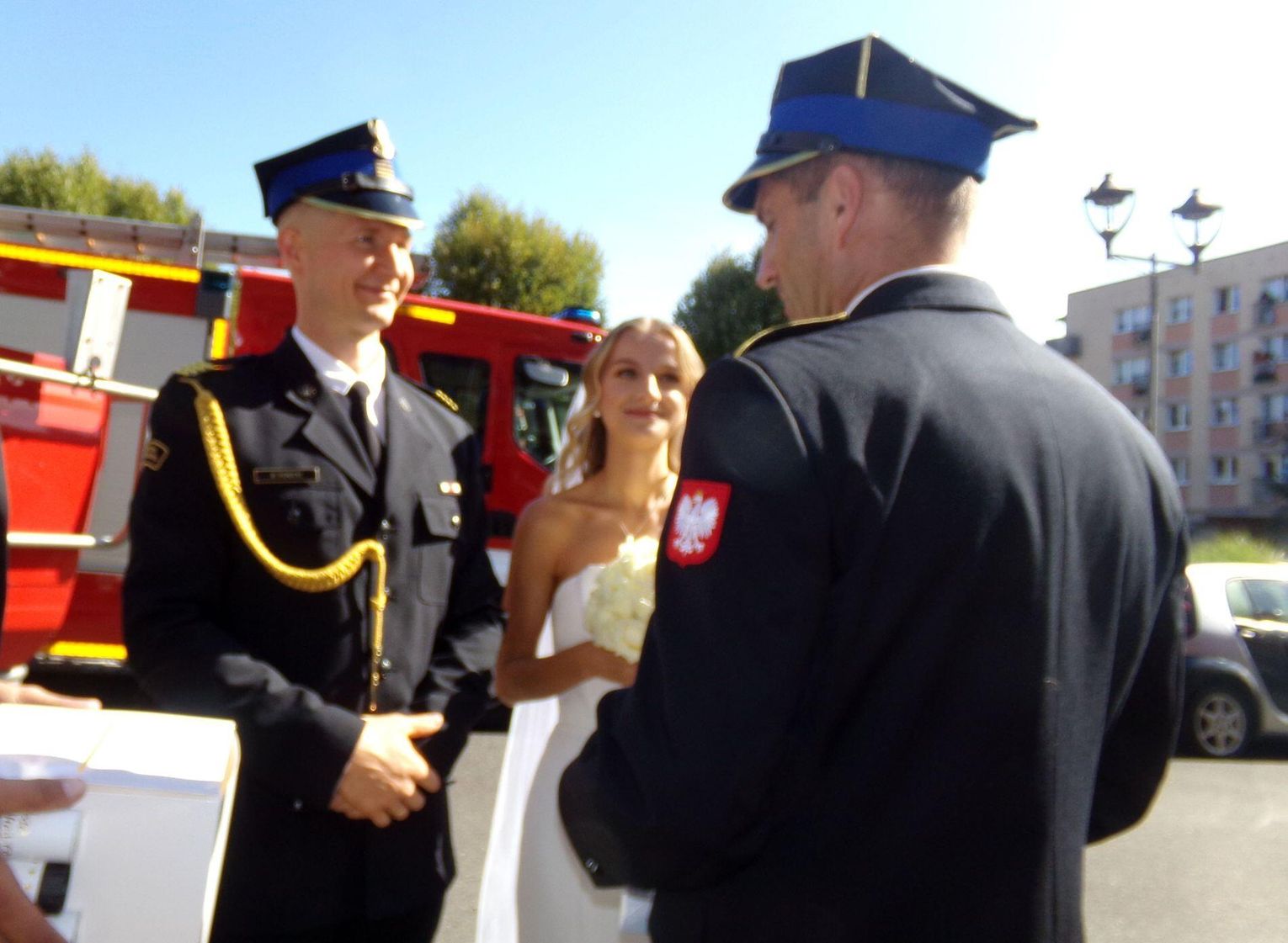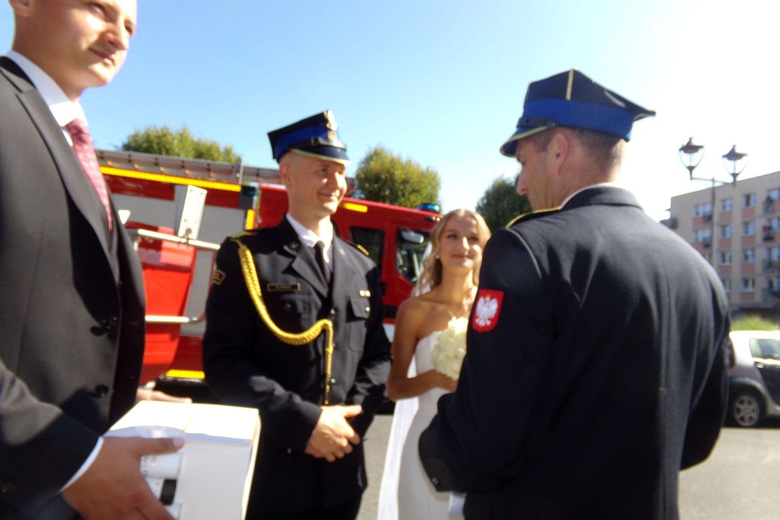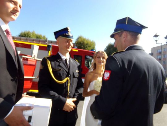 Na nowożeńców czekał strażacki wóz, którym udali się na swoje przyjęcie weselne.