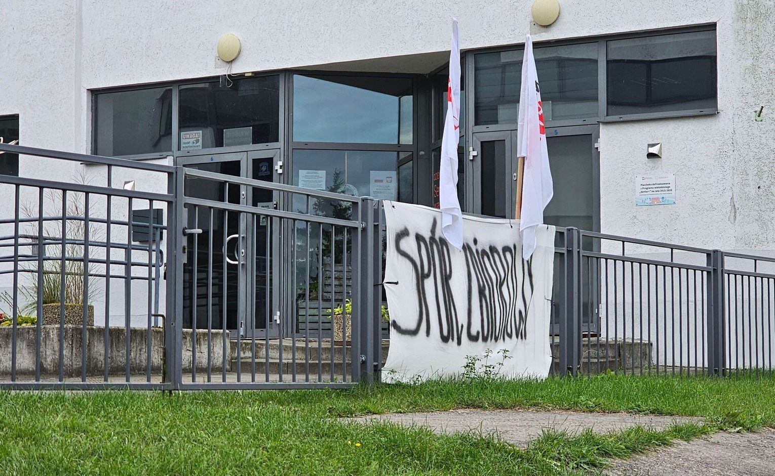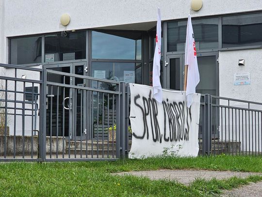 Obiekt jest obwieszony transparentami "SPÓR ZBIOROWY" i oflagowany związkowymi symbolami. W Lagunie trwa bowiem spór o płace, w który włączył się też burmistrz Mieczysław Sawaryn. Spotkał się nawet z przedstawicielem protestujących, ale ostatecznie nie doszło do porozumienia.