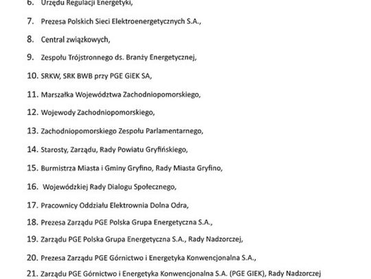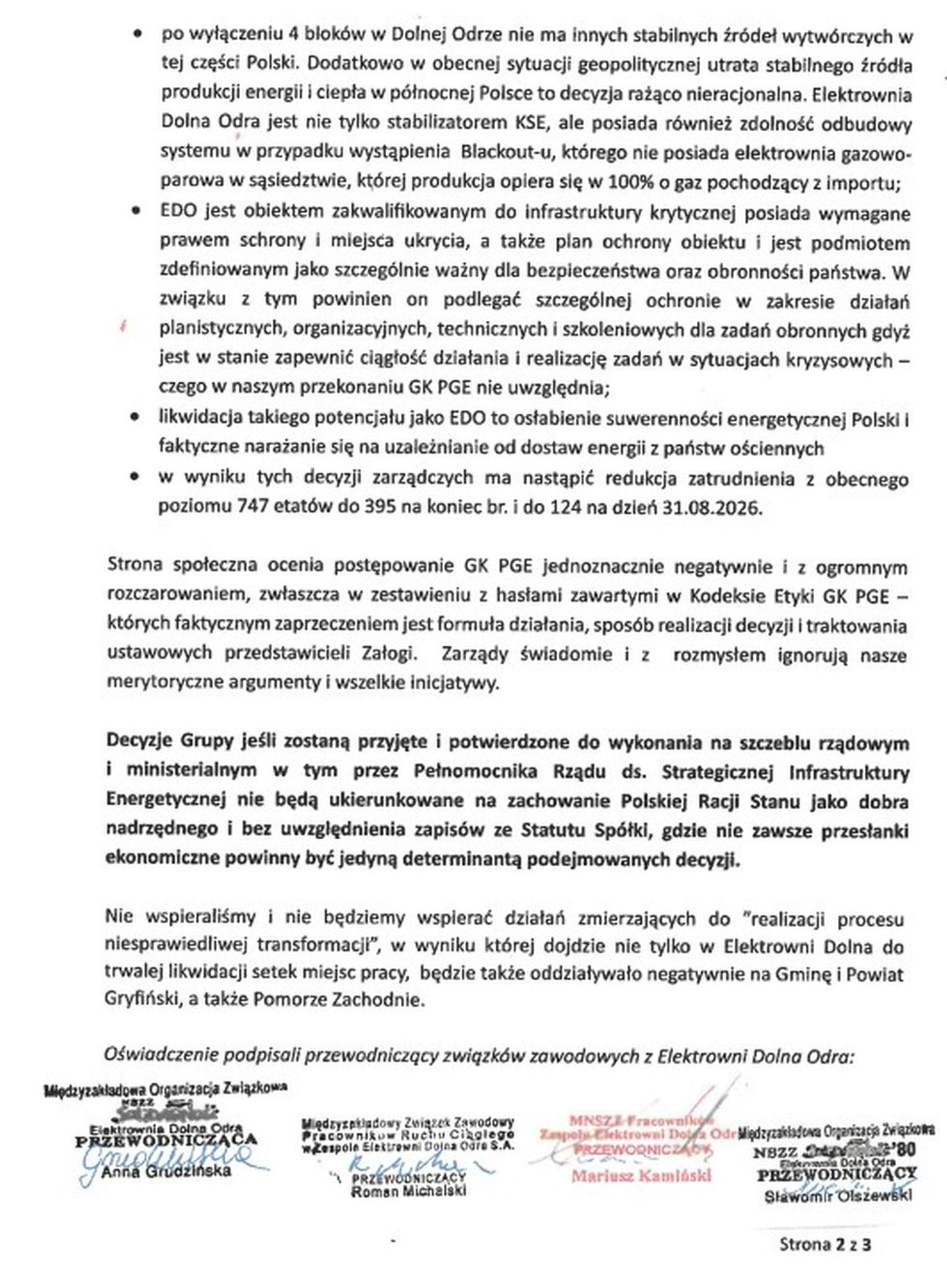 podpisali przewodniczący związków zawodowych z Elektrowni Dolna Odra (oryginał w fotogalerii)