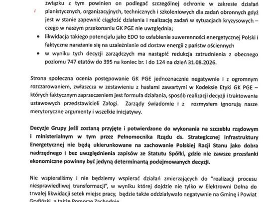 - wyłączenie 2 bloków z dniem 31.12.2025r. i ostatnich dwóch z dniem 31.08.2026r. podaje w wątpliwość uwzględnianie zapisów Statutu GK PGE, w którym jasno wskazano, że podstawowym przedmiotem działania Grupy jest realizowanie zadań związanych z zapewnieniem bezpieczeństwa energetycznego Rzeczypospolitej Polskiej;