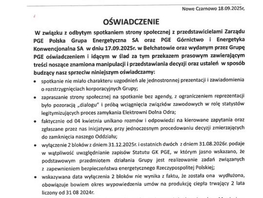 W związku z odbytym spotkaniem strony społecznej z przedstawicielami Zarządu PGE Polska Grupa Energetyczna SA oraz PGE Górnictwo i Energetyka Konwencjonalna SA w dniu 17.09.2025r. w Bełchatowie oraz wydanym przez Grupę PGE oświadczeniem i idącym w ślad za tym przekazem prasowym zawierającym treści noszące znamiona manipulacji i przedstawiania decyzji oraz ustaleń w sposób budzący nasz sprzeciw niniejszym oświadczamy:
