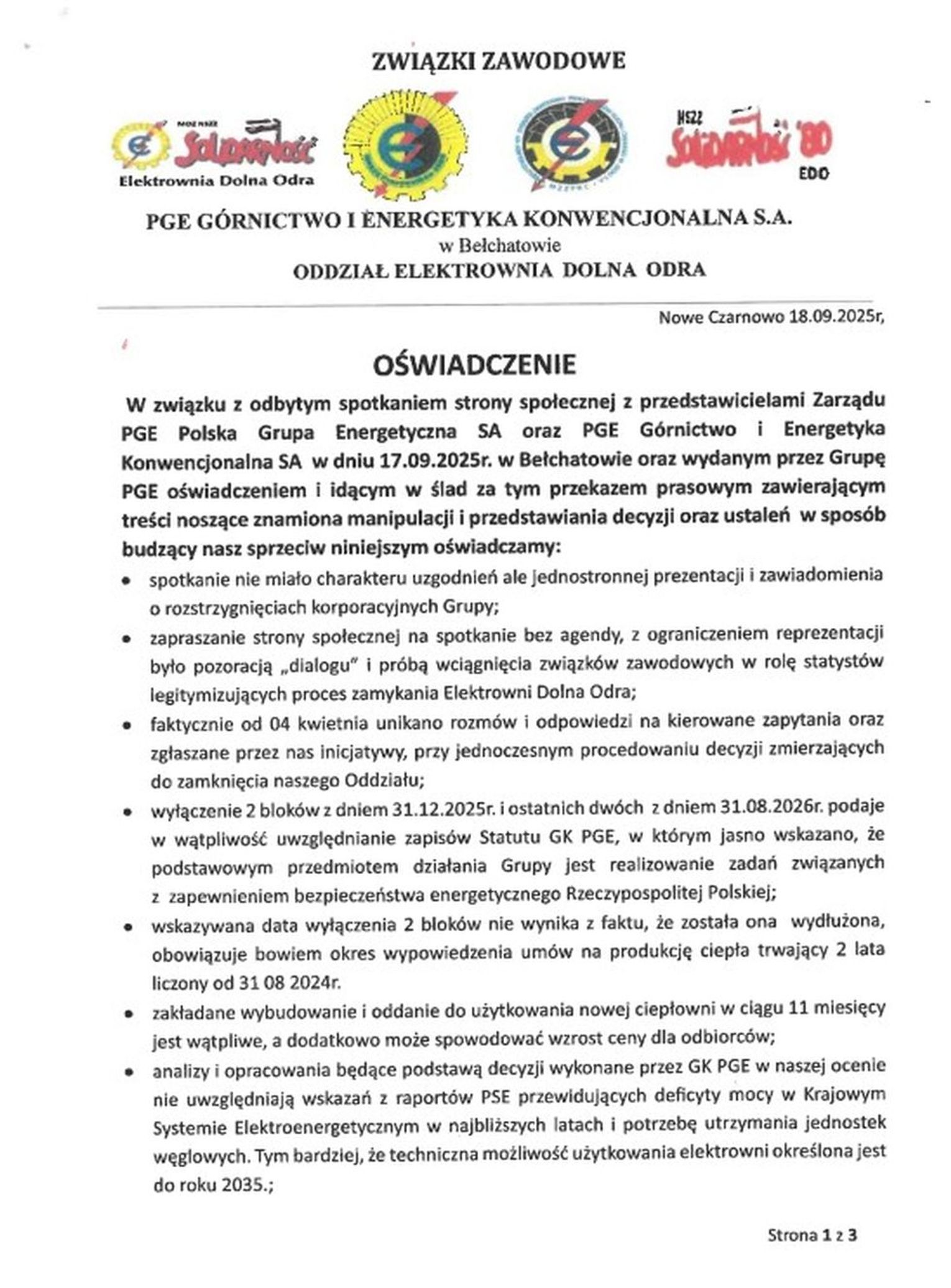 Oświadczenie czterech związków zawodowych z Elektrowni Dolna Odra - Nowe Czarnowo 18.09.2025 r.