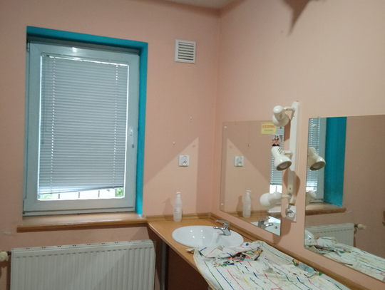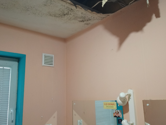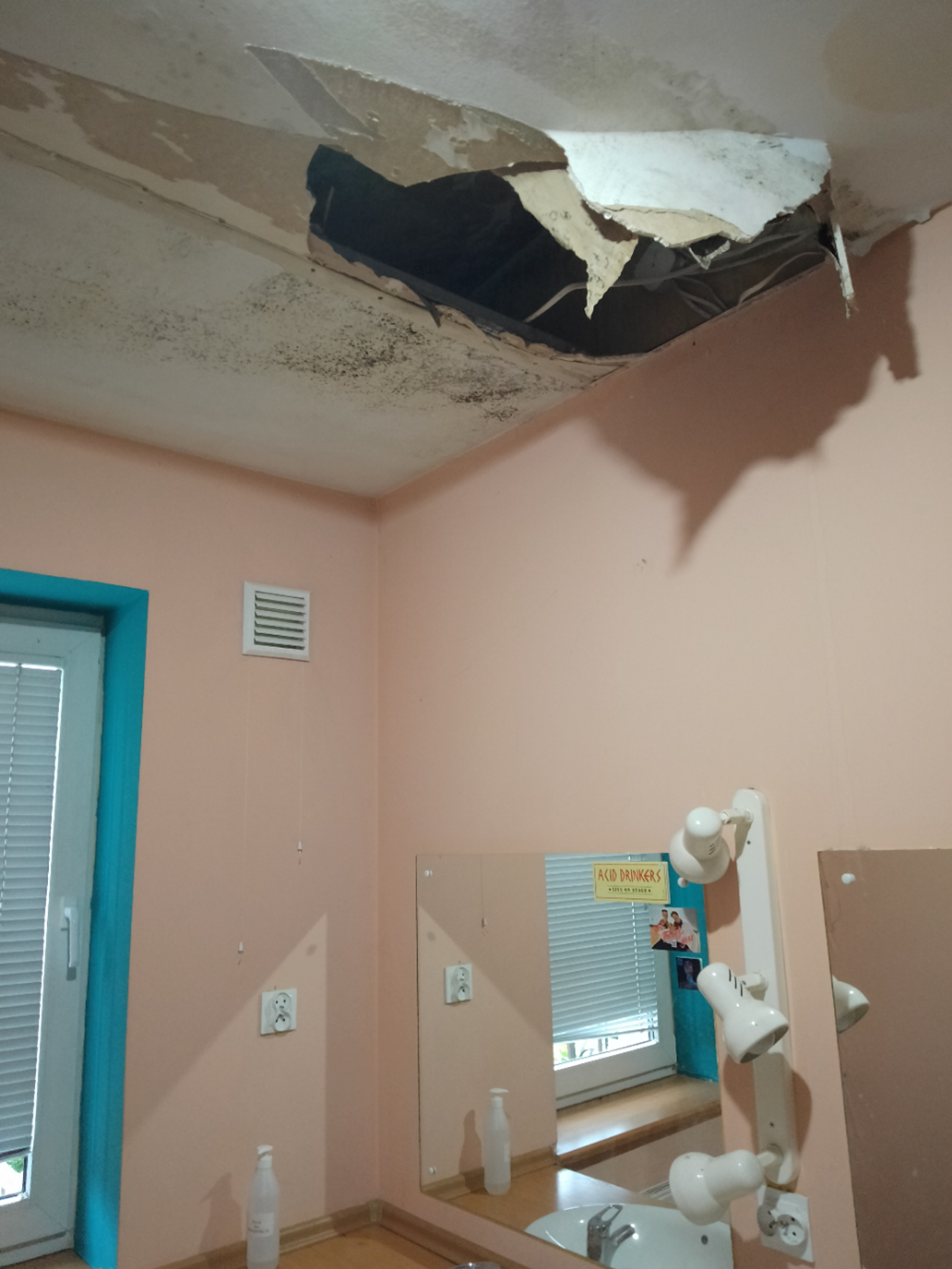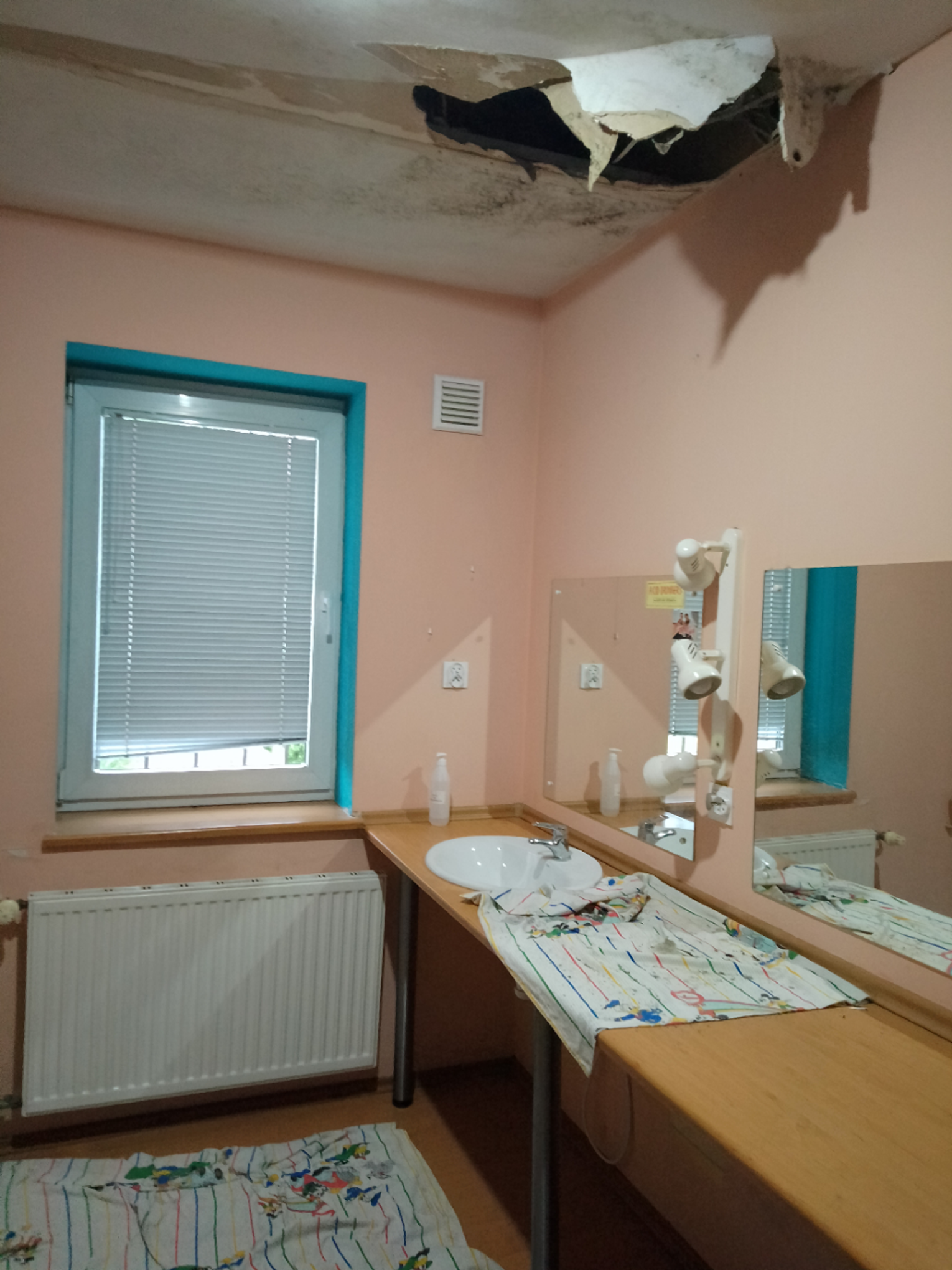 Tego dnia była to okazja aby zobaczyć nie tylko trudno dostępną dla niepełnosprawnych salę kinową, gdzie odbywała się swego rodzaju debata przeciwników utworzenia parku dziurawy sufit przy głównym tego dnia wejściu dla gości, ale też przejść na scenę i zobaczyć garderobę . A tam swoisty Armagedon. Sufit "wpadł" do pomieszczenia. Ale myliłby się ten, kto by myślał, że pomieszczenie zostało zamknięte, Ktoś mi powiedział, że gdyby zamknięto garderobę to na tej samej podstawie można by zamknąć cały obiekt.