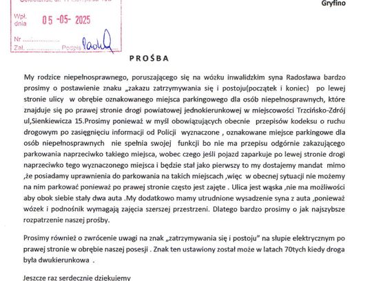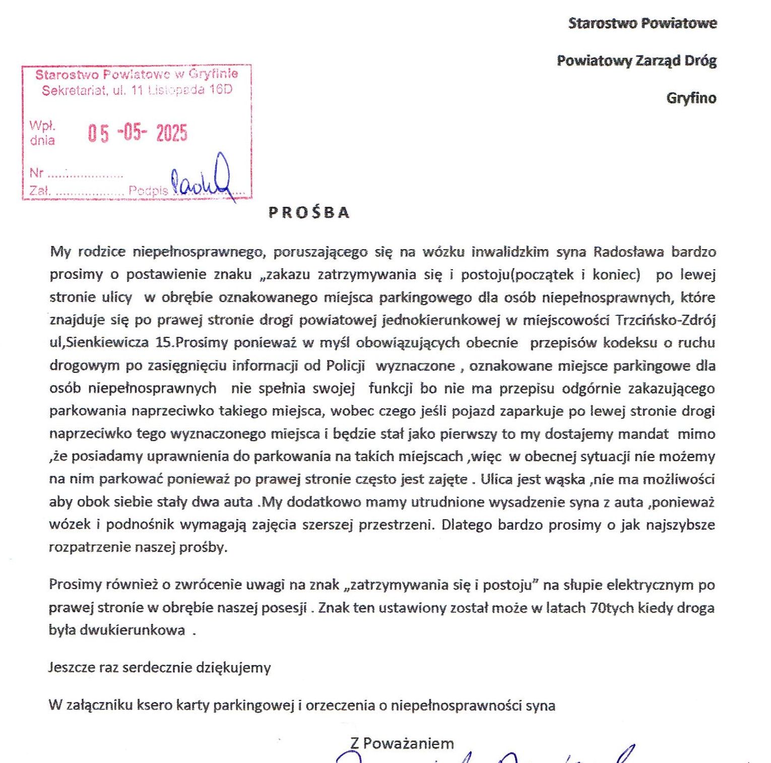 W miejscowości Trzcińsko-Zdrój na ul. Sienkiewicza 15 drogi powiatowej jest wyznaczone miejsce parkingowe dla osób niepełnosprawnych. 5 maja 2025 r. poprosiliśmy pisemnie (pismo w fotogalerii – przyp. red.) zarząd dróg w Gryfinie o postawienie w obrębie tego miejsca zakazu zatrzymywania, ponieważ niestety w myśl polskiego kodeksu drogowego jeśli ktoś stanie naprzeciwko miejsca dla niepełnosprawnych, to osoba z uprawnieniami nie może już zatrzymać się na wyznaczonym miejscu. I takie sytuacje miały miejsce. Poprosiliśmy o pomoc. Do dziś nie otrzymaliśmy żadnej odpowiedzi pisemnej. Po dzisiejszym kontakcie telefonicznym z zarządem dróg otrzymaliśmy odpowiedź ustną, że miejsce zostanie przeniesione na drugą stronę. Argumenty nasze -że to jest absurdalny pomysł, ponieważ chodnik jest krzywy, wąski zdemolowany i bardzo wysokie krawężniki - nic nie dały. Podjęli decyzję zza biurka bez jakichkolwiek konsultacji społecznych jak i bez odpowiedzi nam na nasze pismo w ustawowym terminie, prawdopodobnie po to, abyśmy nie mieli możliwość odwołania się. Na nasze argumenty, że po drugiej stronie to nie ma sensu robienia miejsca dla niepełnosprawnych, bo osoba niepełnosprawna nie będzie miała możliwości w ogóle wysiadania z auta, upierają się przy swoim. Zakupiliśmy tez mechanizm dla wózka, który pasuje tylko do tej strony, zwłaszcza, że ma być ruch jednokierunkowy. Po kolejnej rozmowie telefonicznej z urzędnikiem z zarządu dróg w Gryfinie (nie przedstawił się) otrzymali dodatkową informację ,że to przeniesienie zrobili po rozmowach z burmistrzem Bartłomiejem Wróblem. Przypuszczamy, że może to być też dla tego, że w tym nowym miejscu także burmistrz parkuje. Dlaczego zmiana ma nastąpić z niekorzyścią dl osoby niepełnosprawnej, a z udogodnieniami dla zdrowych wybranych?! A na długości całej ulicy po prawej stronie ma byś postawiony znak zakaz zatrzymywania Agnieszka Dorociak Arkadiusz Dorociak