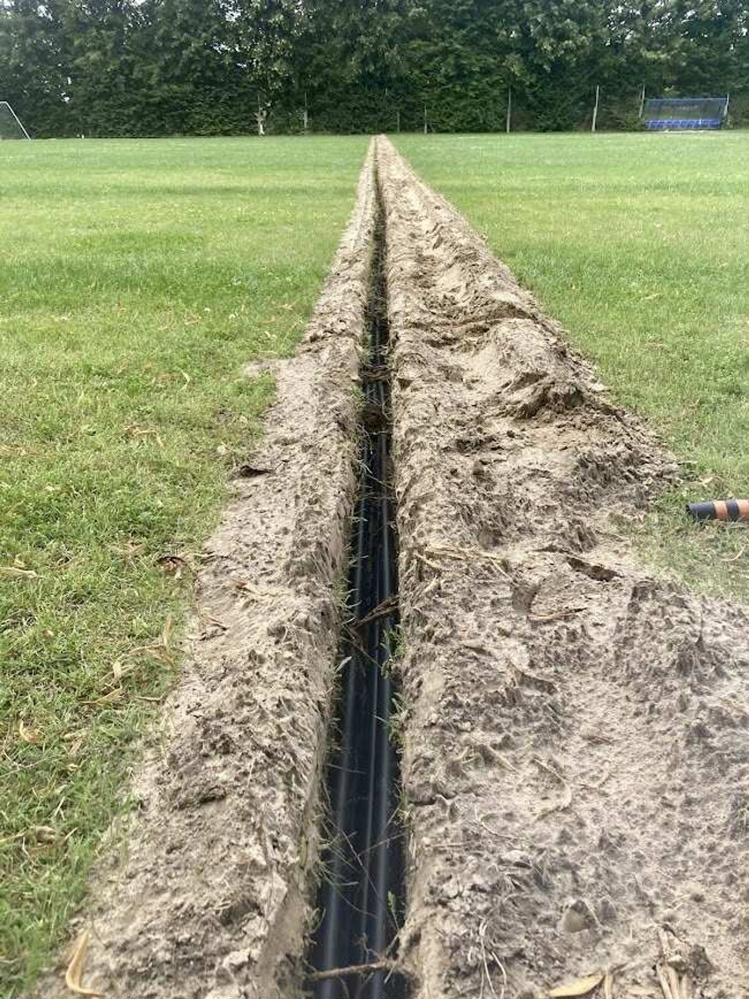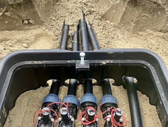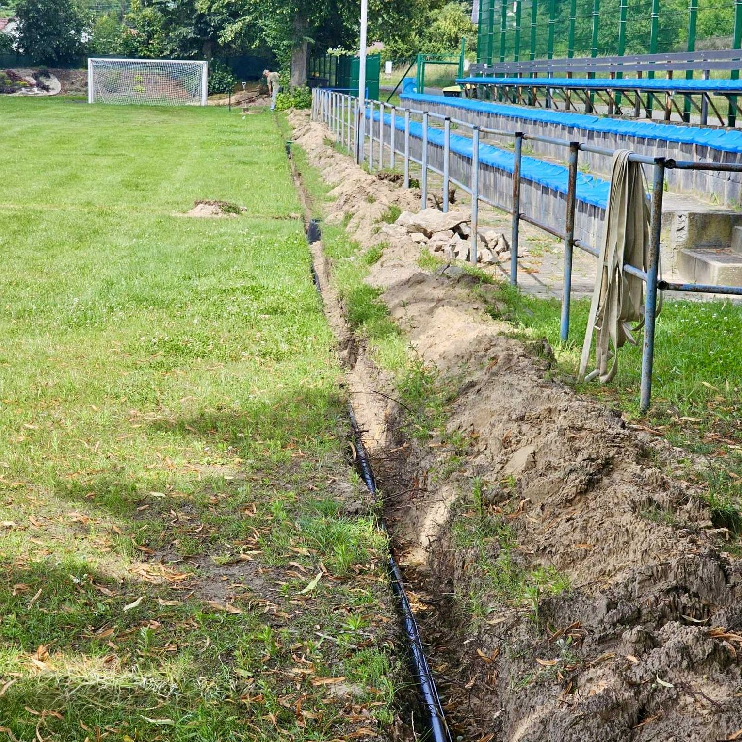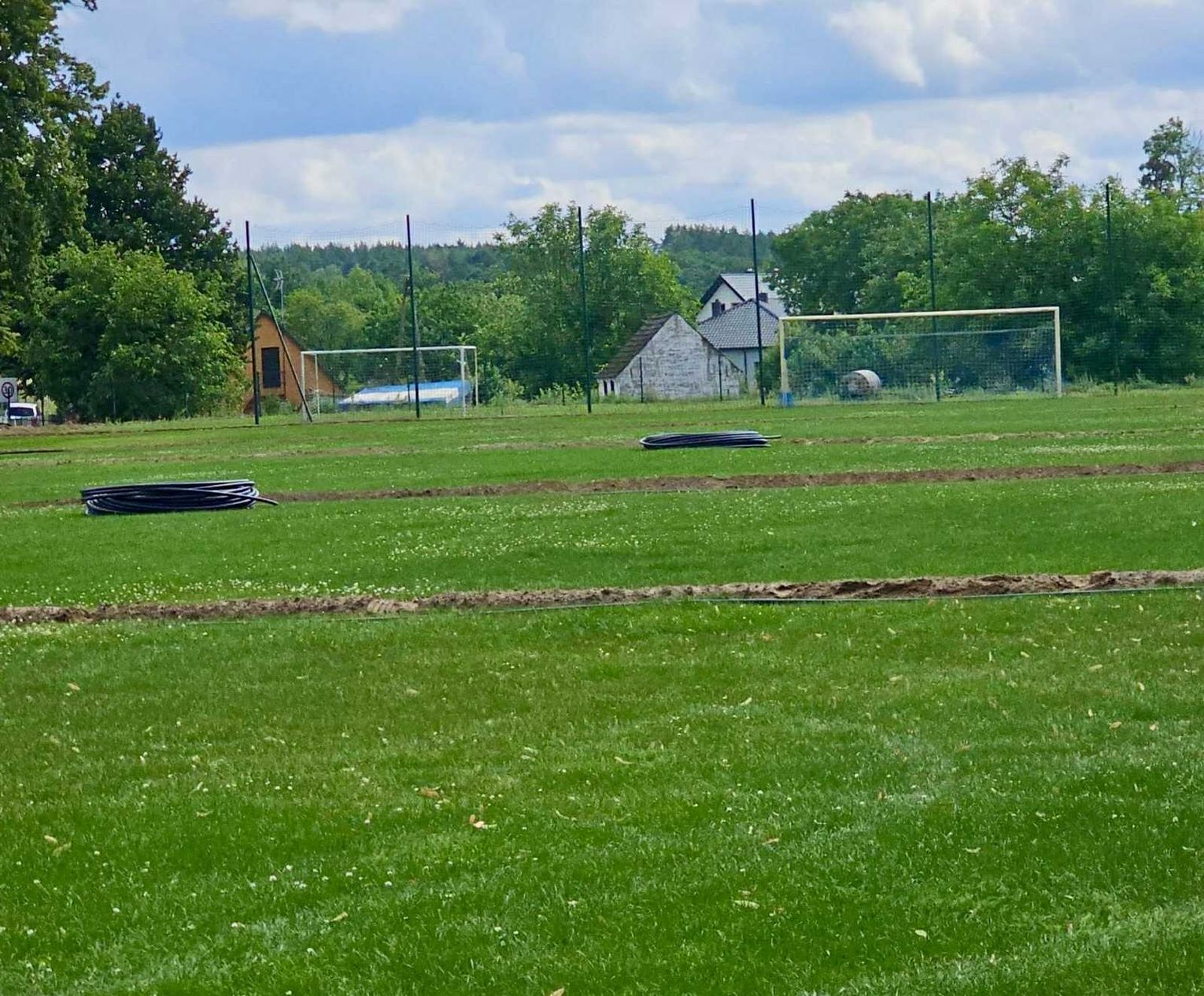 - Profesjonalne zraszacze: Zamontowano łącznie 28 zraszaczy w obrębie głównego boiska i poza liniami oraz dodatkowe 4 sztuki na boisku treningowym.
