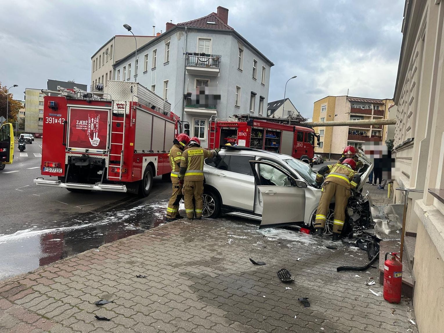 Strażacy, oprócz zabezpieczenia miejsca wypadku i odłączenia akumulatora w rozbitym pojeździe, musieli również podjąć działania związane z uszkodzeniem infrastruktury budynku.