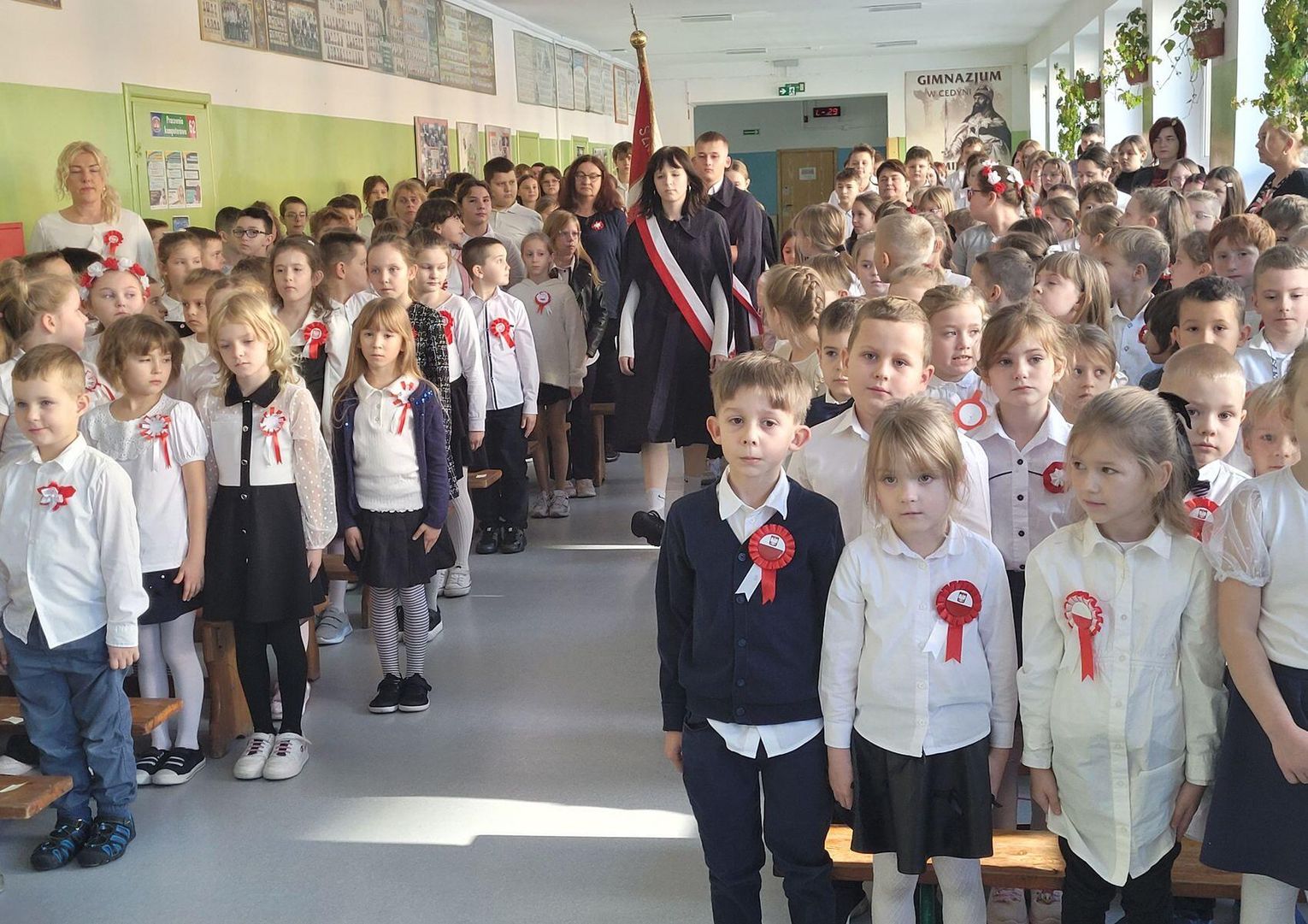 Po wprowadzeniu sztandaru szkoły, cała społeczność włączyła się w ogólnopolską akcję „Szkoła do Hymnu”. Uroczysta chwila wspólnego odśpiewania hymnu nabrała wyjątkowego, podniosłego charakteru dzięki nauczycielowi muzyki, Sylwestrowi Blachnierkowi, który zapewnił akompaniament na trąbce.