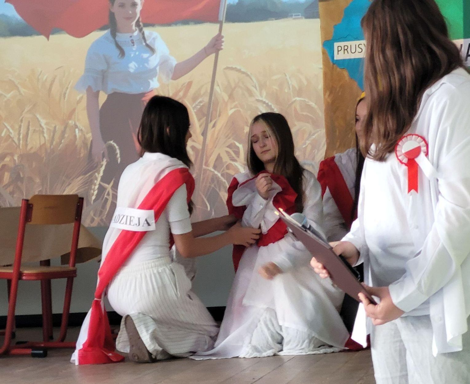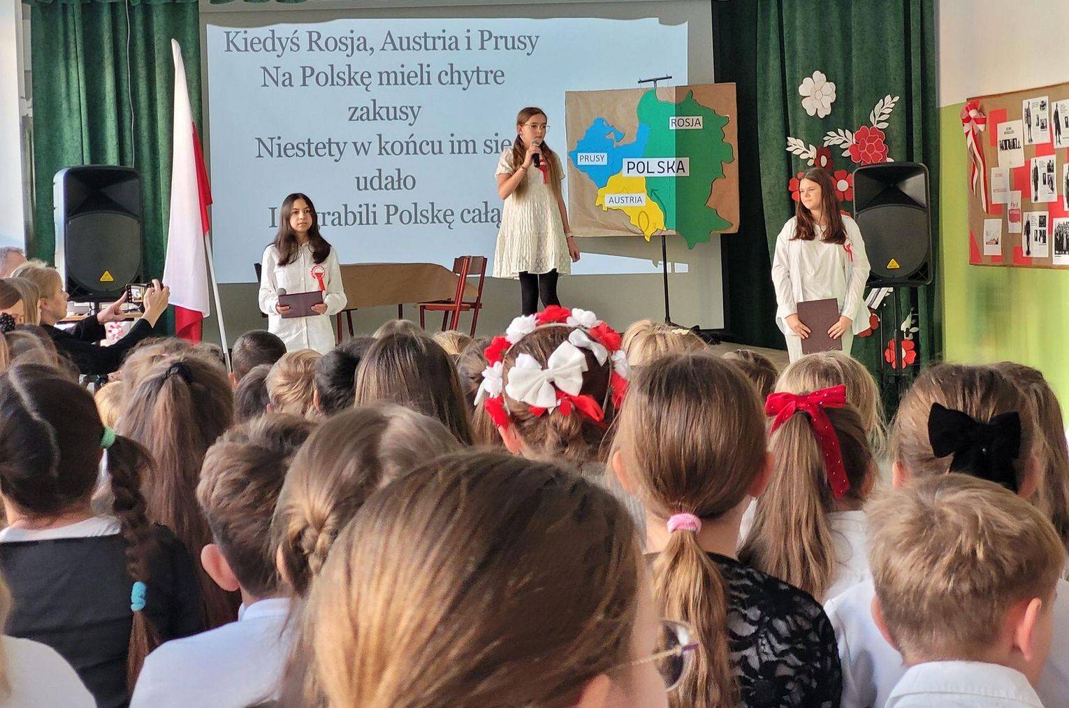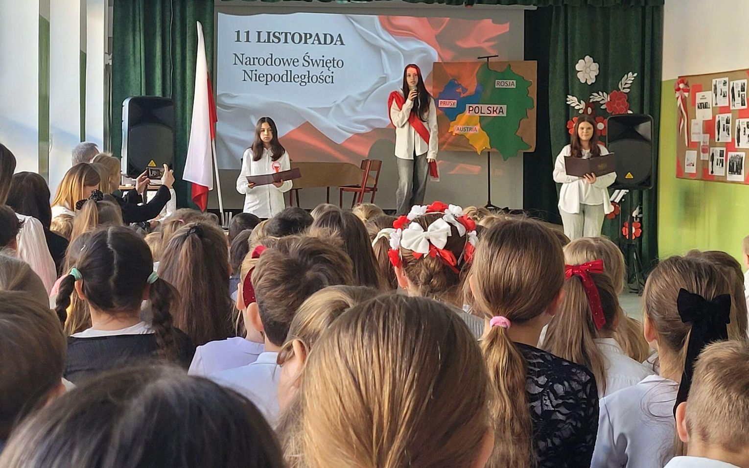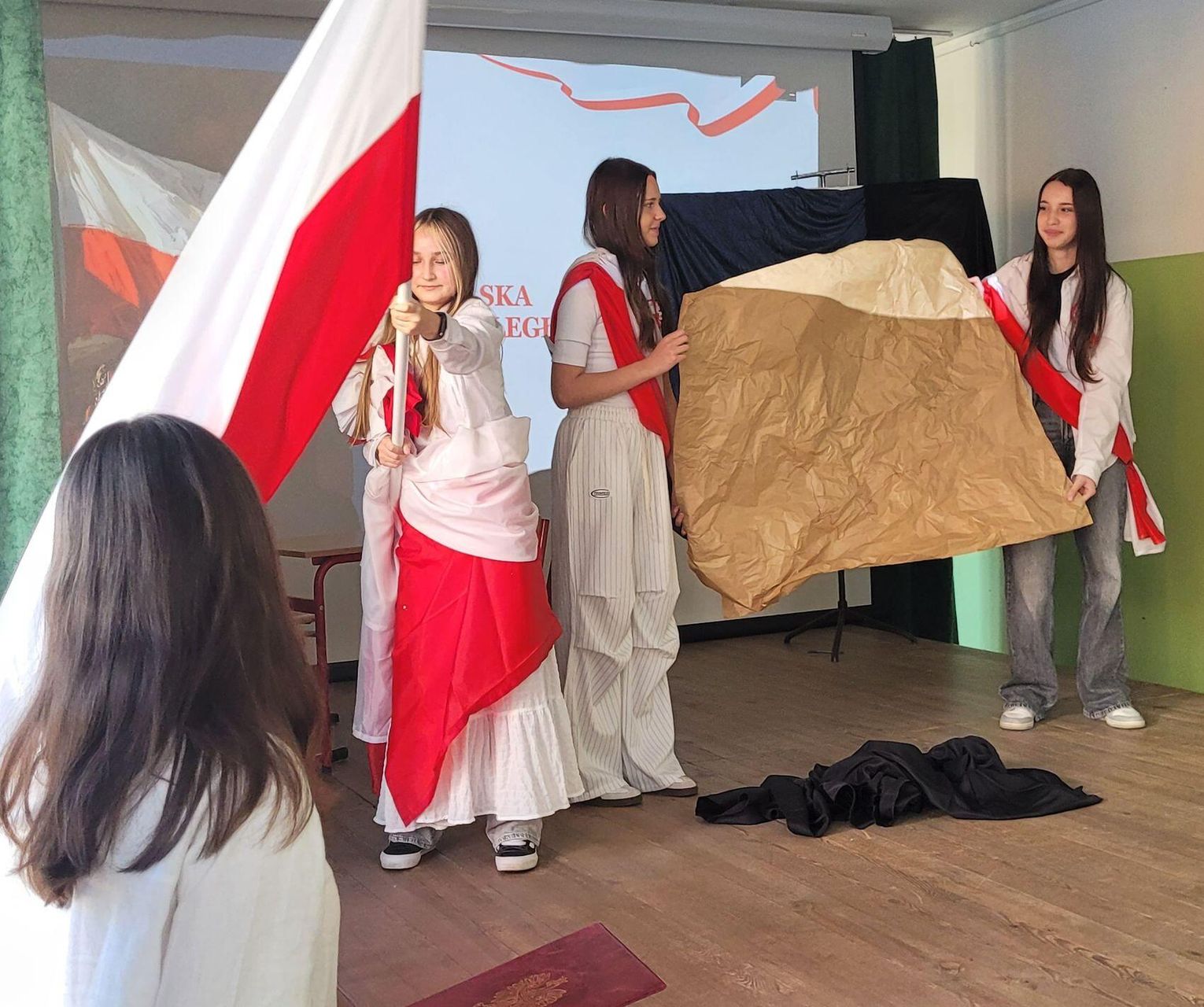 Następnie nadszedł czas na poruszającą część artystyczną, przygotowaną przez uczniów klas siódmych. Młodzi artyści zaprezentowali niecodzienną i bardzo wymowną formę przekazu – pantomimę pt. „Droga do Niepodległości”. Spektakl, celowo pozbawiony słów, opowiadał o najtrudniejszym czasie w dziejach Polski – 123 latach niewoli. Symbolicznie ukazano trzy rozbiory, ale przede wszystkim niezłomność polskiego ducha, który przetrwał dzięki powstaniom, wierze i pamięci o języku. Wyciszona forma skłoniła do głębokiej refleksji nad ceną wolności.
