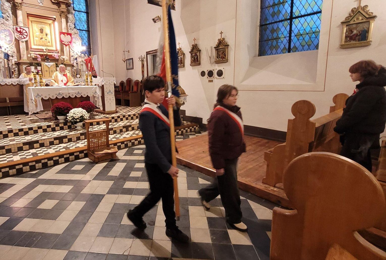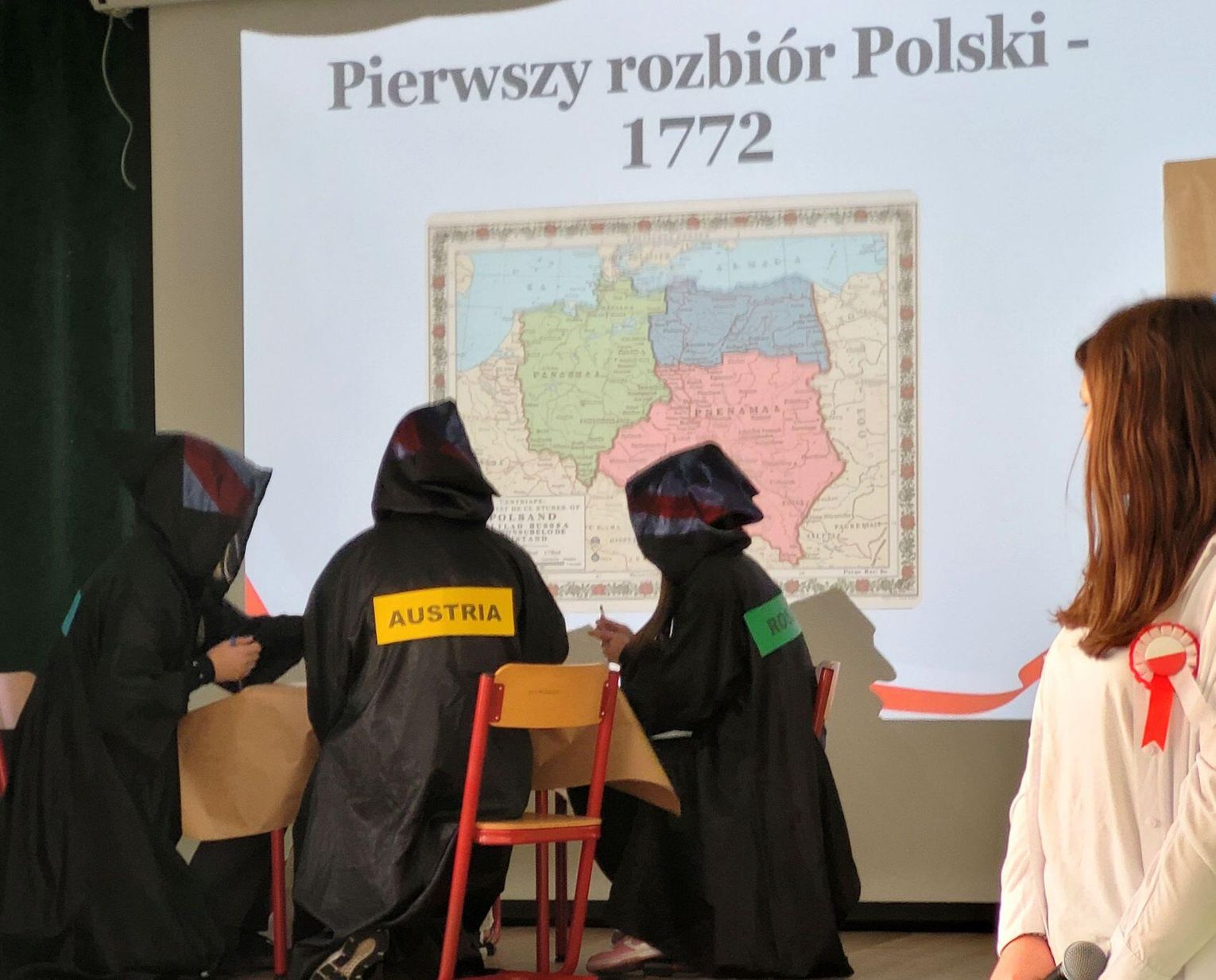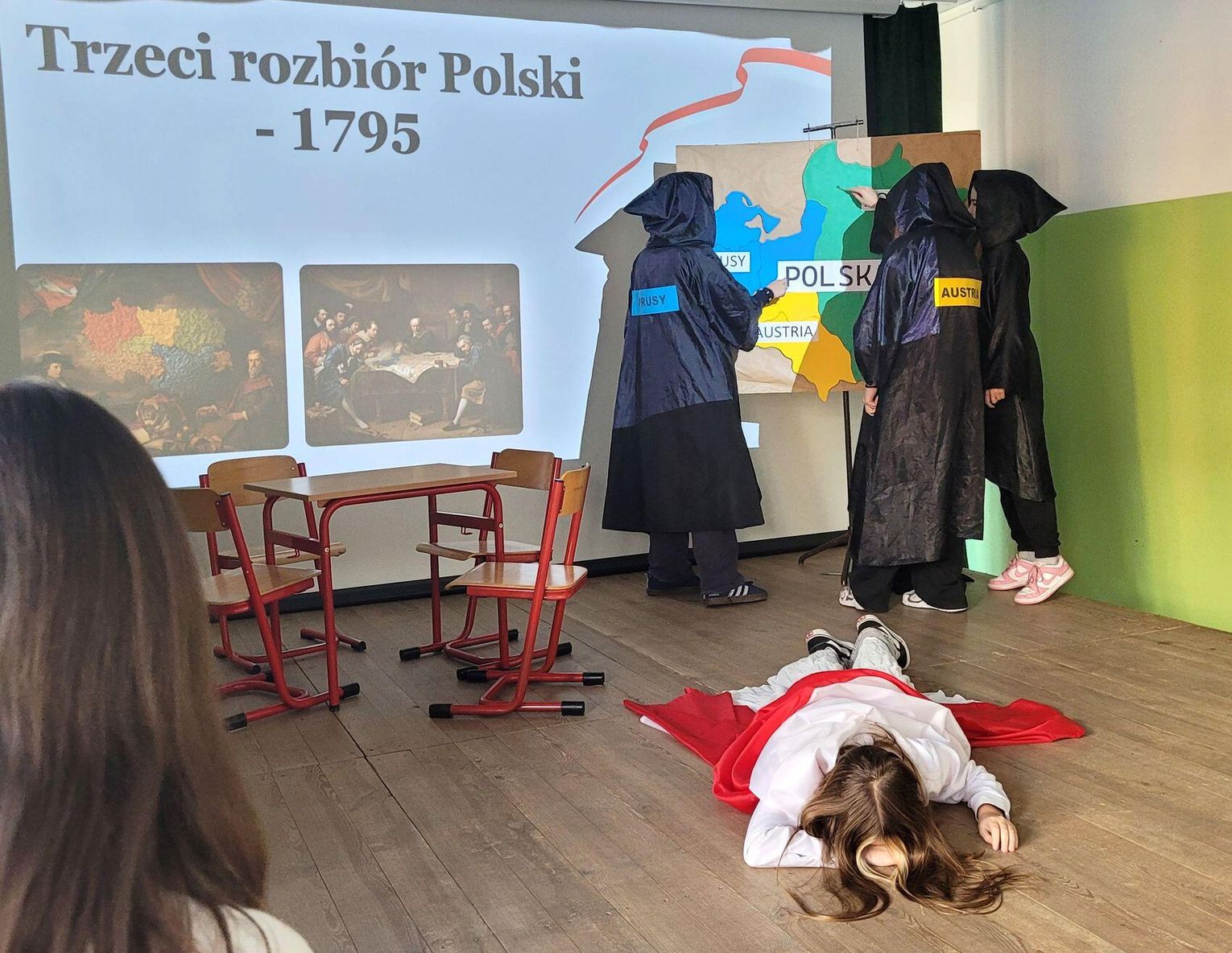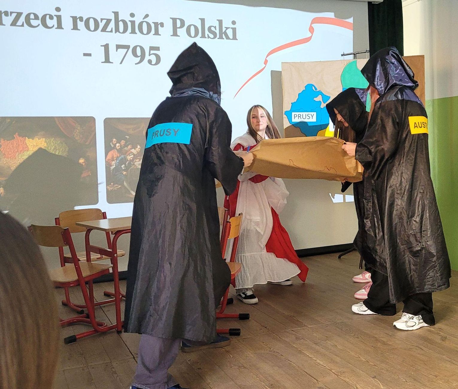 Następnie nadszedł czas na poruszającą część artystyczną, przygotowaną przez uczniów klas siódmych. Młodzi artyści zaprezentowali niecodzienną i bardzo wymowną formę przekazu – pantomimę pt. „Droga do Niepodległości”. Spektakl, celowo pozbawiony słów, opowiadał o najtrudniejszym czasie w dziejach Polski – 123 latach niewoli. Symbolicznie ukazano trzy rozbiory, ale przede wszystkim niezłomność polskiego ducha, który przetrwał dzięki powstaniom, wierze i pamięci o języku. Wyciszona forma skłoniła do głębokiej refleksji nad ceną wolności.