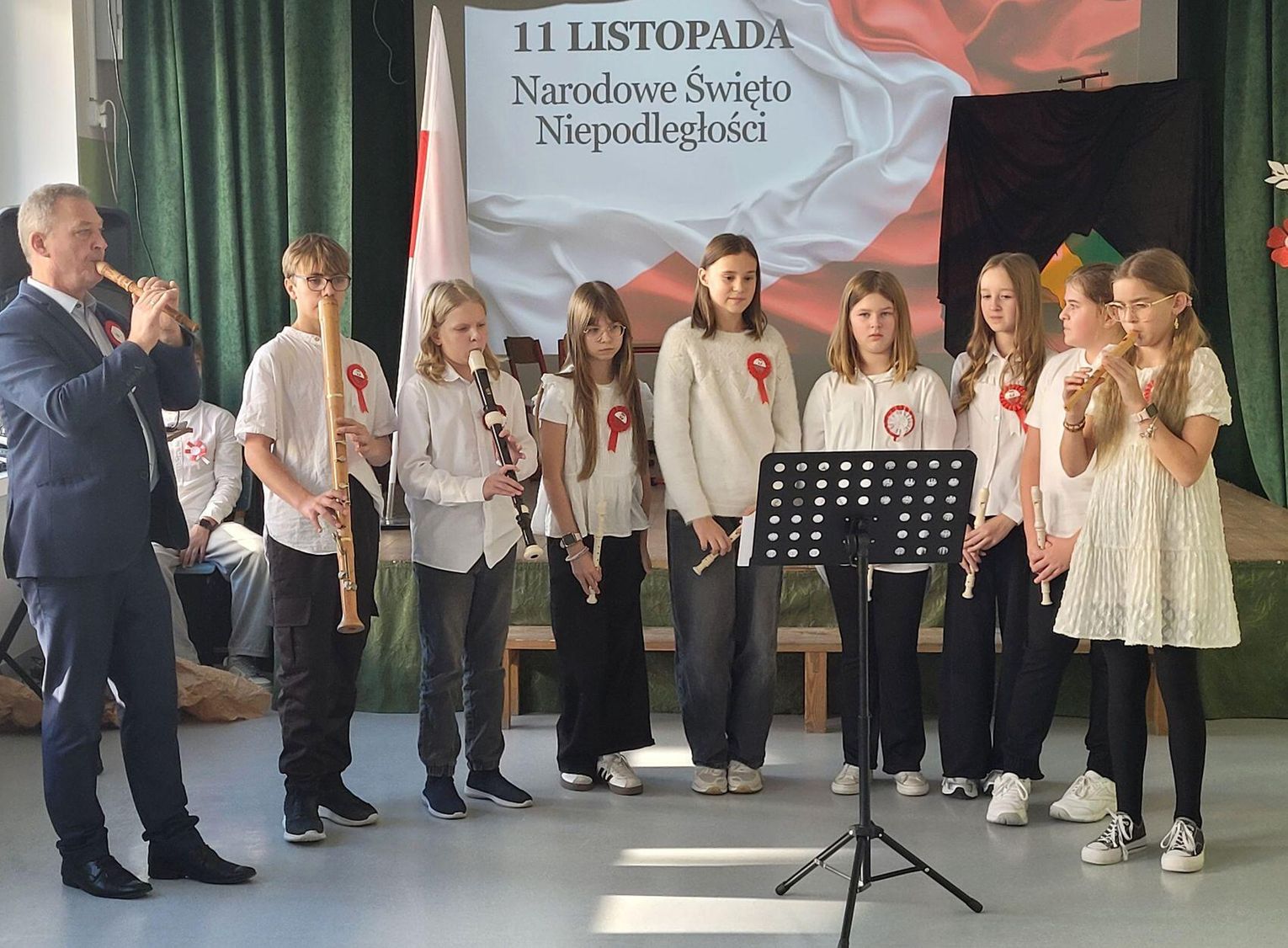 Uroczystość dopełniła piękna poezja – recytacja wiersza „11 Listopada” Ludwika Wiszniewskiego oraz pieśni patriotyczne: „Co to jest Niepodległość” i „Dzień dobry, Polsko!”. Historyczne akcenty wniosła także muzyka: uczniowie zagrali na fletach melodie towarzyszące żołnierzom Piłsudskiego w ich drodze do niepodległości. Uczniom przypomniano o szacunku dla symboli narodowych, konieczności nauki historii i bycia dobrymi, odpowiedzialnymi Polakami.