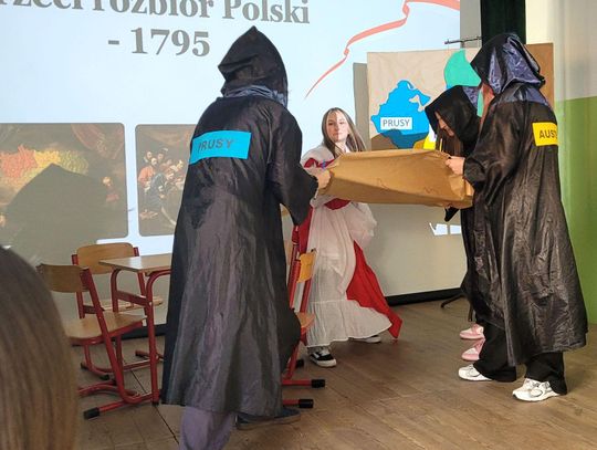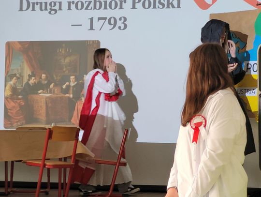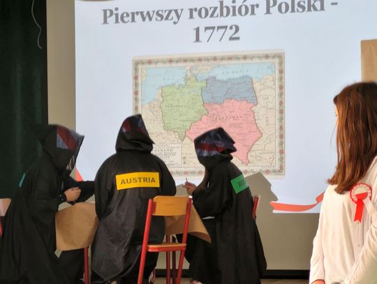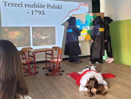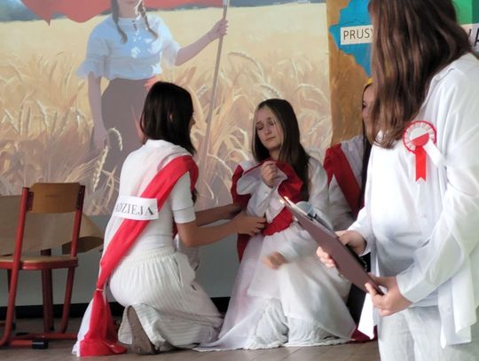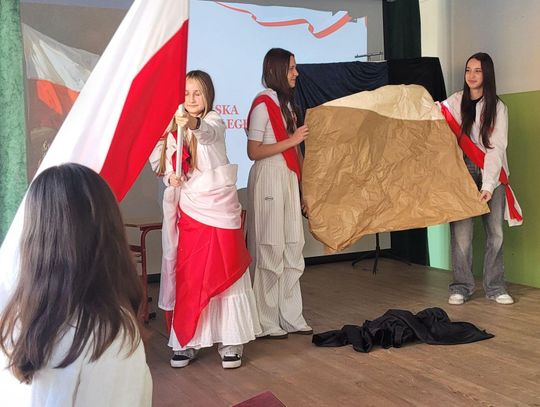 Następnie nadszedł czas na poruszającą część artystyczną, przygotowaną przez uczniów klas siódmych. Młodzi artyści zaprezentowali niecodzienną i bardzo wymowną formę przekazu – pantomimę pt. „Droga do Niepodległości”. Spektakl, celowo pozbawiony słów, opowiadał o najtrudniejszym czasie w dziejach Polski – 123 latach niewoli. Symbolicznie ukazano trzy rozbiory, ale przede wszystkim niezłomność polskiego ducha, który przetrwał dzięki powstaniom, wierze i pamięci o języku. Wyciszona forma skłoniła do głębokiej refleksji nad ceną wolności.