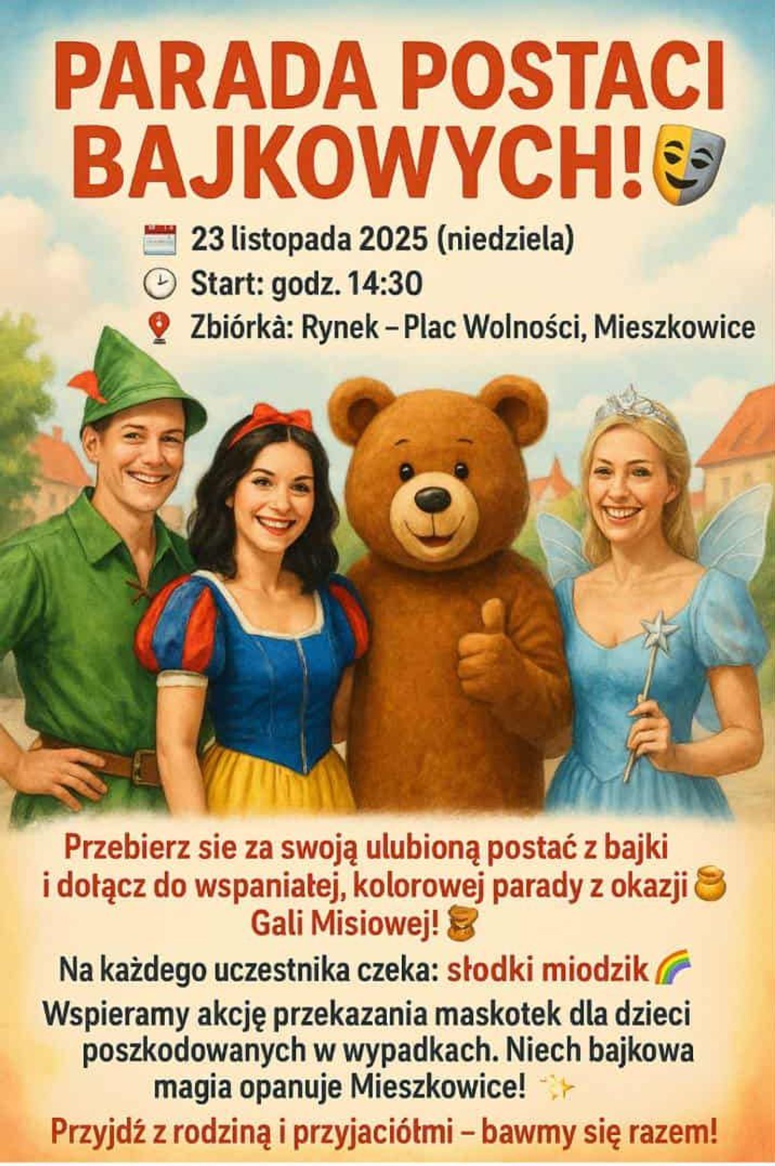 Czy pamiętacie, jak wielką moc ma przyjaźń i dobro? Pokażmy to razem! W Mieszkowicach 23 listopada 2025 r. o godzinie 14:30 rusza Parada Postaci Bajkowych. Gorąco zachęcamy Was, byście przebrali się w stroje swoich ulubionych bohaterów. Księżniczki, superbohaterowie, misie, zwierzaki – wszyscy razem, w barwnym korowodzie, przejdą ulicami Mieszkowic, niosąc przesłanie, że w każdym z nas drzemie bohater gotowy do czynienia dobra.
