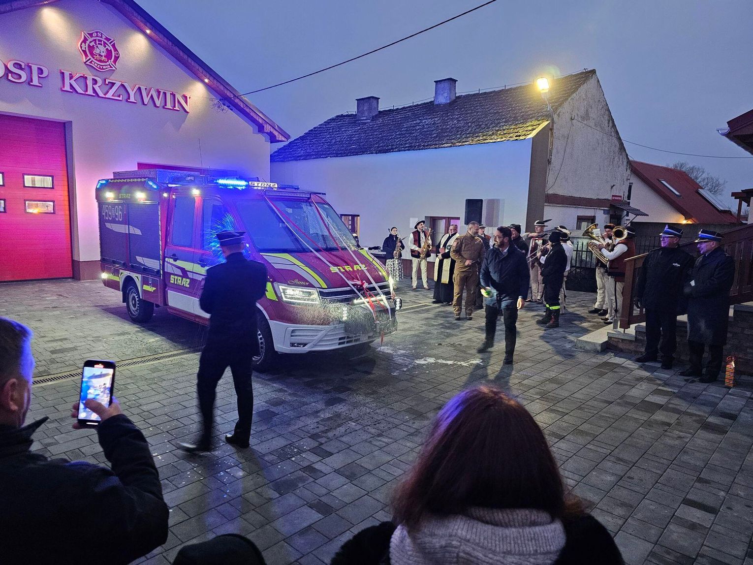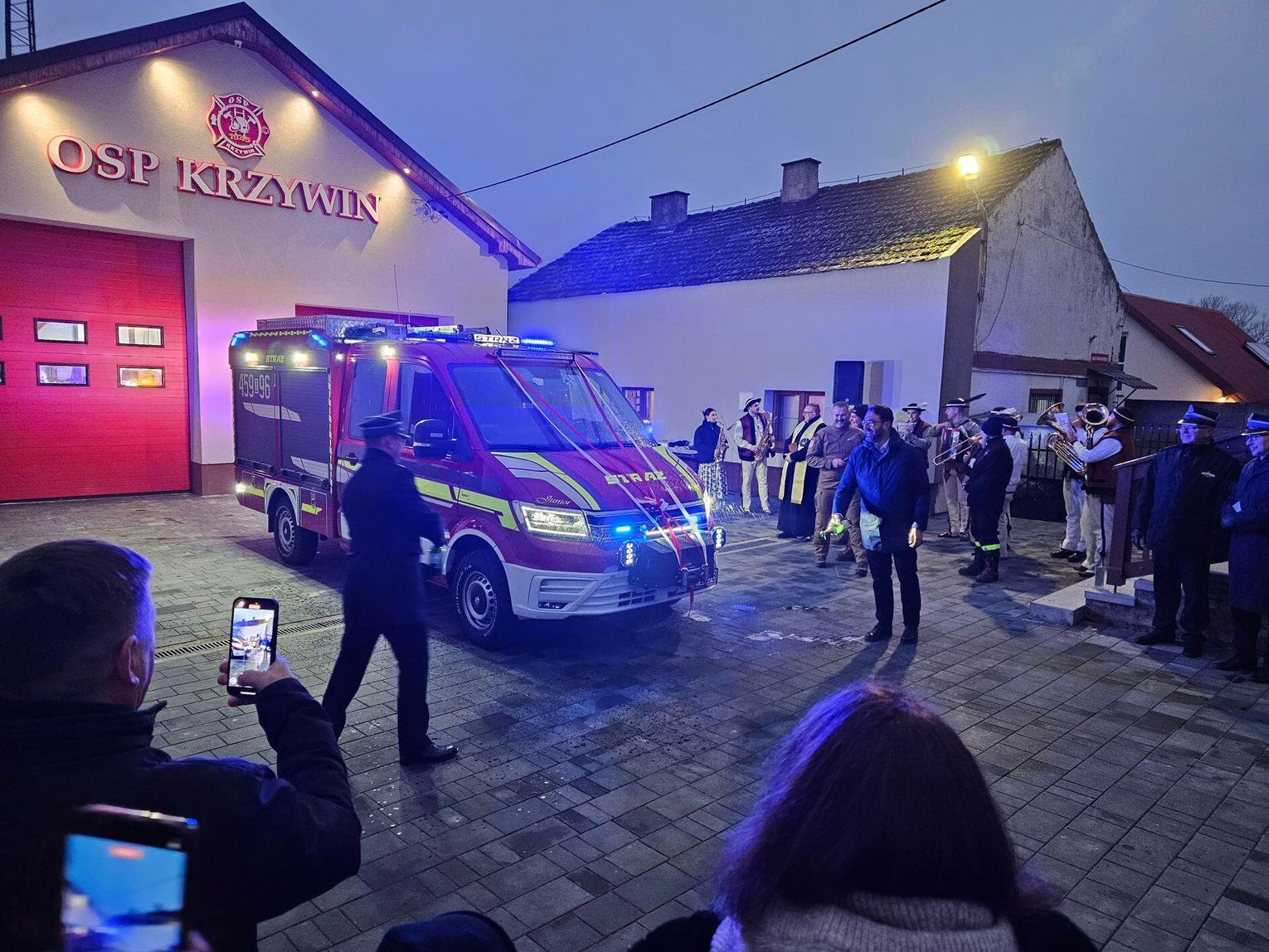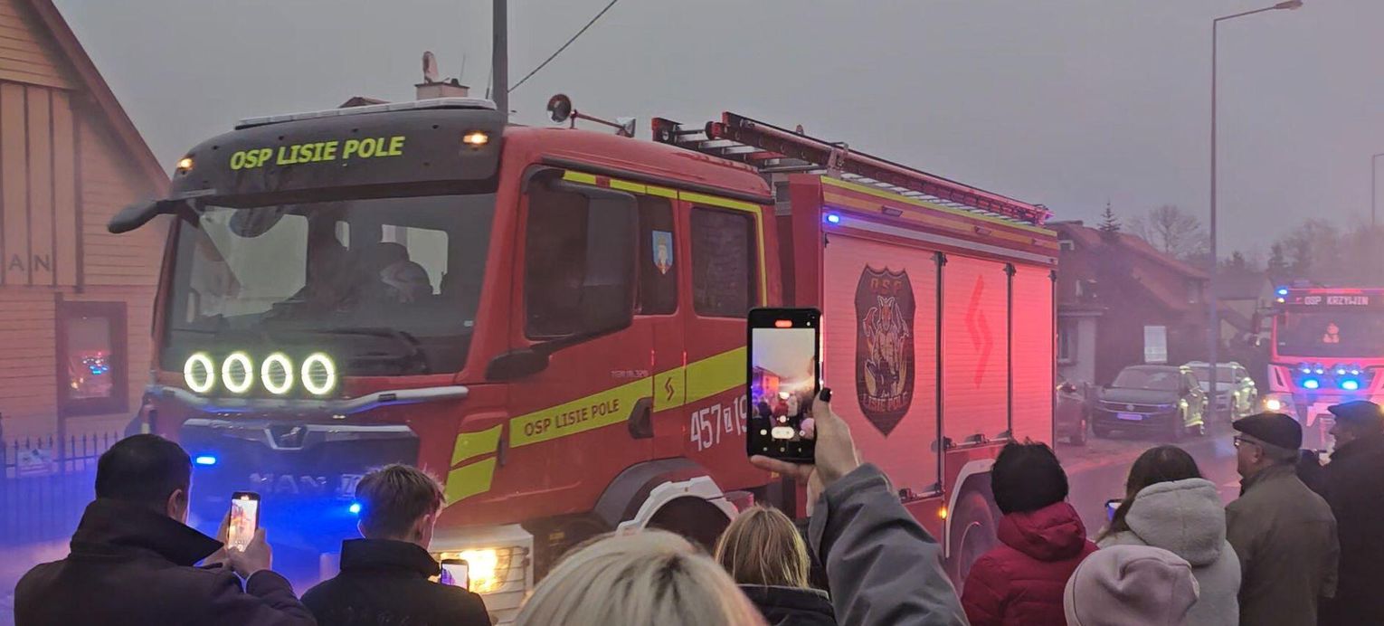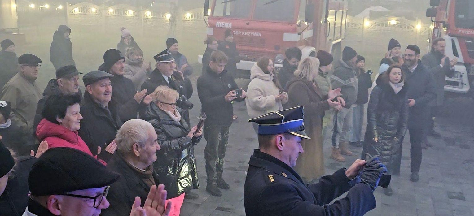 Emocje sięgnęły zenitu, gdy odpalono race włączono syreny i na plac wjechał lśniący, czerwony samochód. Wyjątkową oprawę muzyczną tego wydarzenia zapewniła Orkiestra Dęta z zaprzyjaźnionej jednostki OSP w Tenczynie. Ich energetyczny występ dodał uroczystości niezwykłego, podniosłego charakteru.