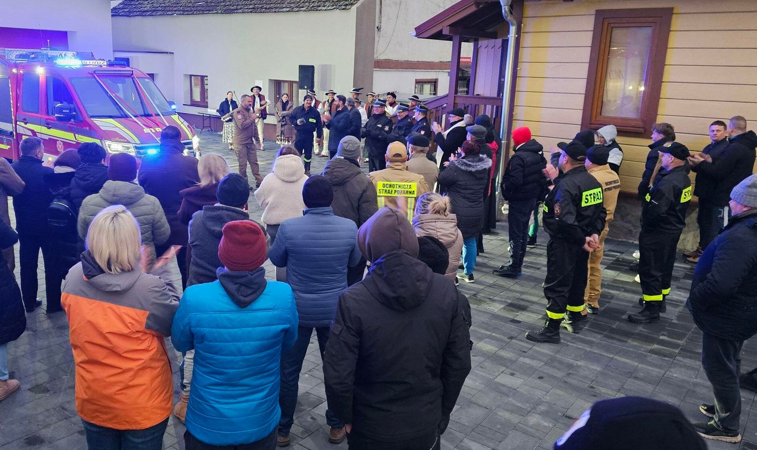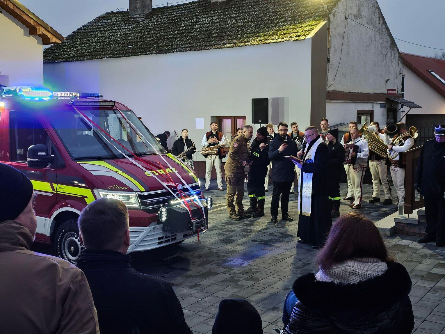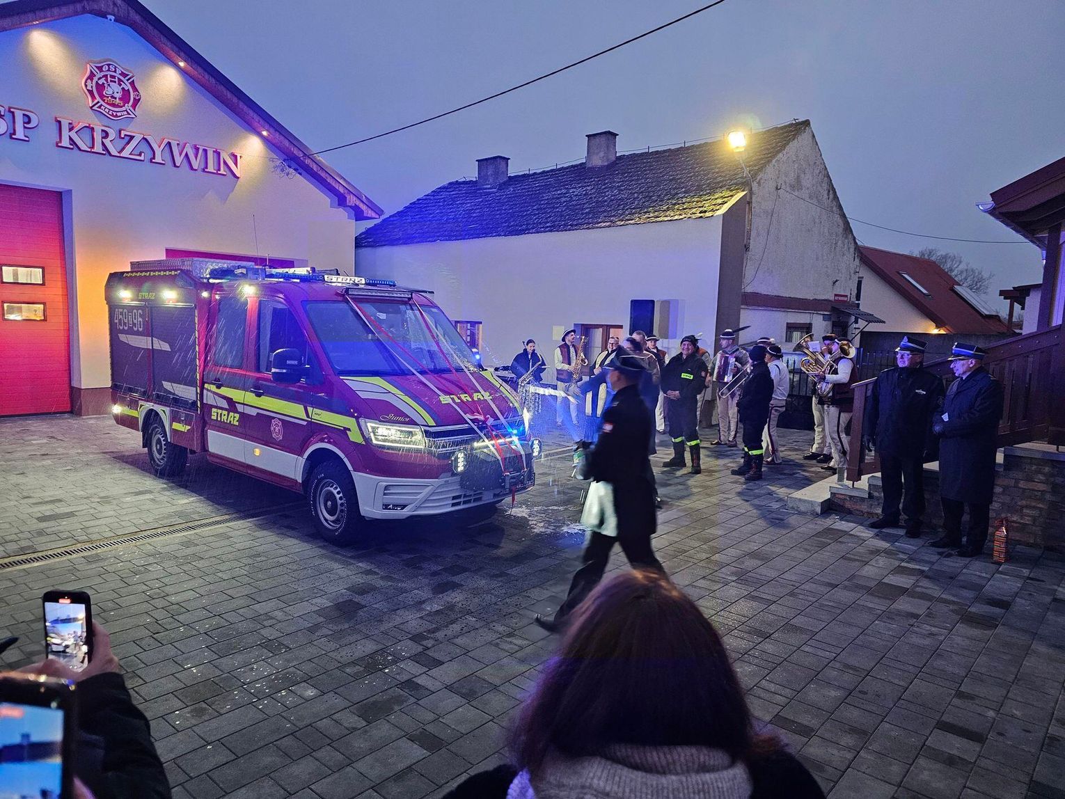 Emocje sięgnęły zenitu, gdy odpalono race włączono syreny i na plac wjechał lśniący, czerwony samochód. Wyjątkową oprawę muzyczną tego wydarzenia zapewniła Orkiestra Dęta z zaprzyjaźnionej jednostki OSP w Tenczynie. Ich energetyczny występ dodał uroczystości niezwykłego, podniosłego charakteru.