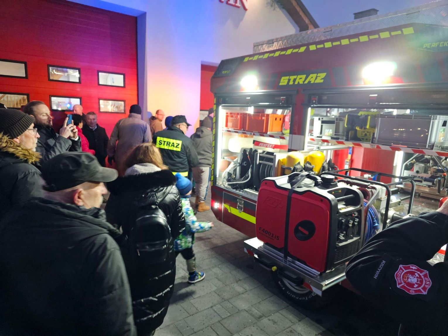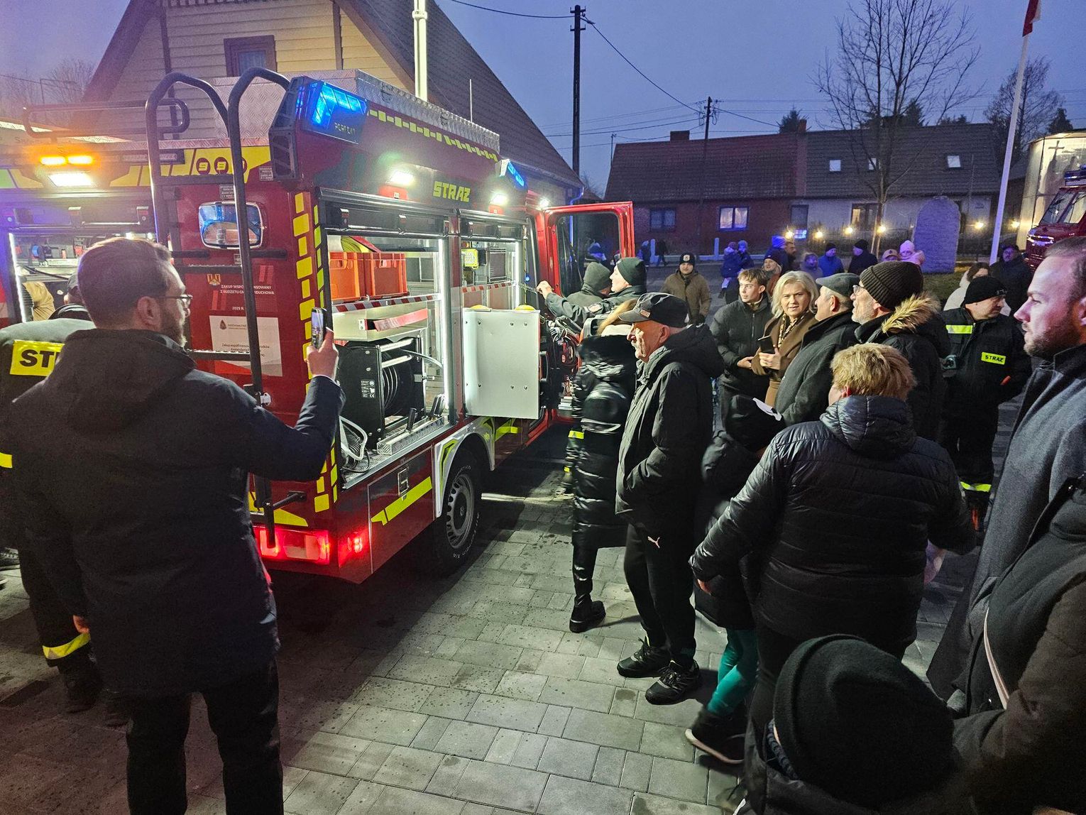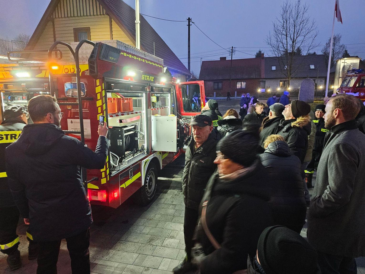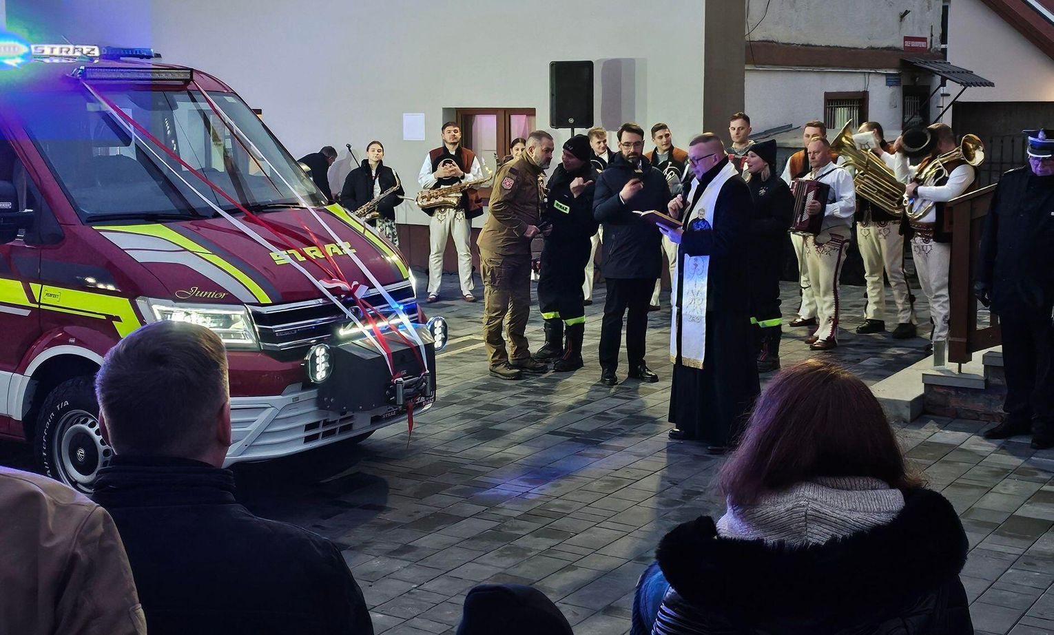 Emocje sięgnęły zenitu, gdy odpalono race włączono syreny i na plac wjechał lśniący, czerwony samochód. Wyjątkową oprawę muzyczną tego wydarzenia zapewniła Orkiestra Dęta z zaprzyjaźnionej jednostki OSP w Tenczynie. Ich energetyczny występ dodał uroczystości niezwykłego, podniosłego charakteru.