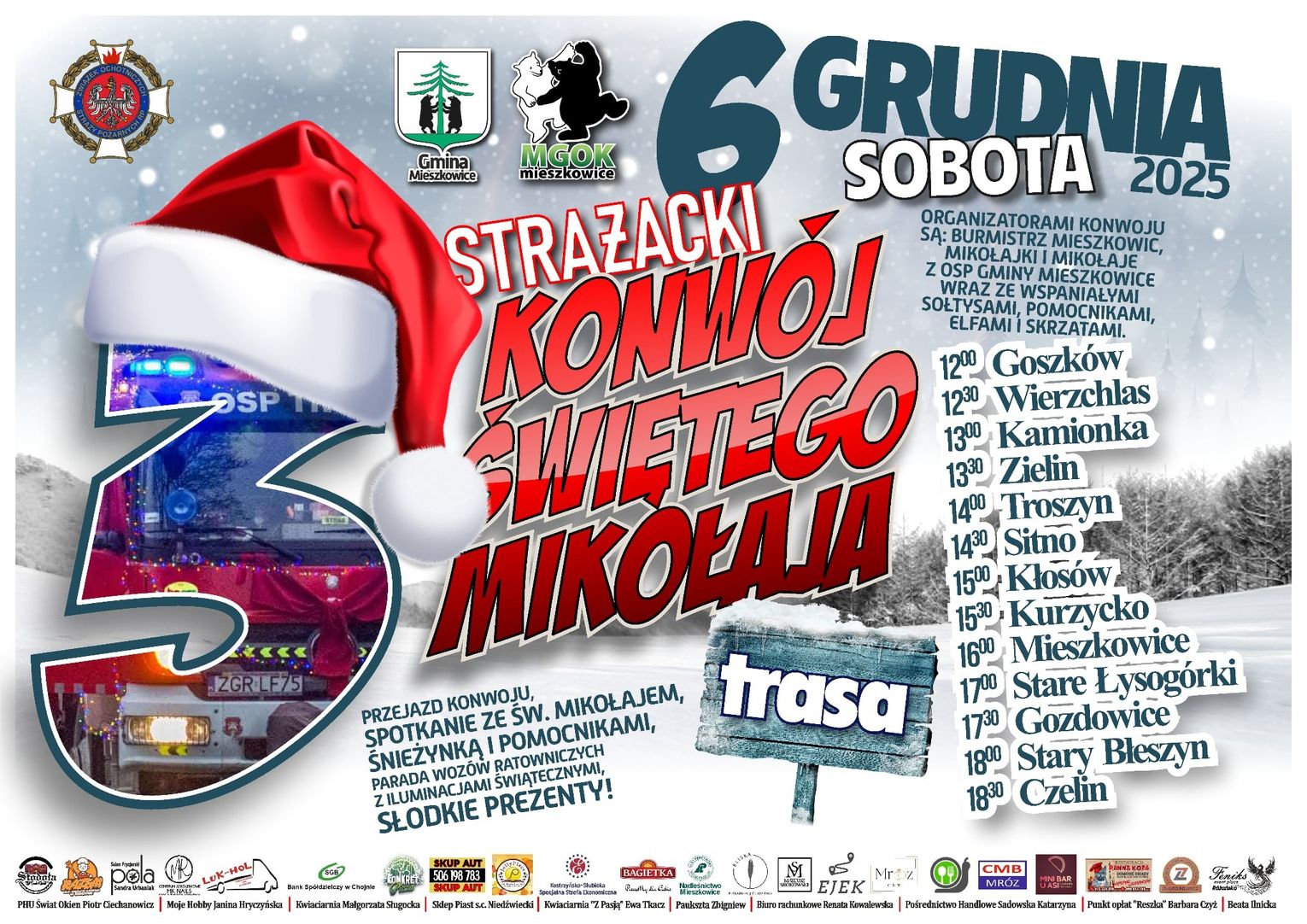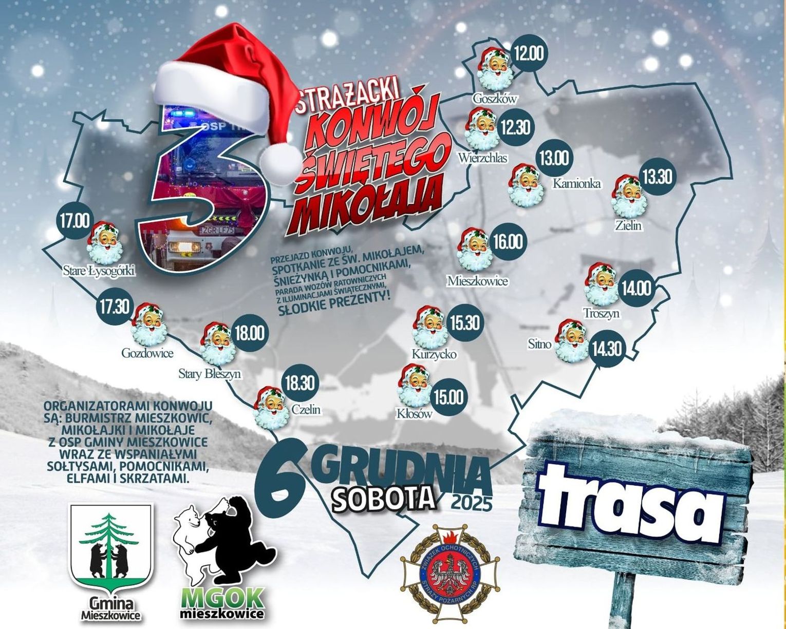 Z inicjatywy emanuje ogromny entuzjazm, co potwierdzają sami organizatorzy. Ewa Panek z OSP Troszyn z radością informuje: „Już w sobotę 6 grudnia 2025 r. odbędzie się III STRAŻACKI KONWÓJ ŚWIĘTEGO MIKOŁAJA organizowany przez jednostki OSP z gminy Mieszkowice. Na plakacie prezentujemy trasę przejazdu i loga naszych wspaniałych sponsorów cukierków, czyli naszych prywatnych Mikołajów. Pozdrawiamy serdecznie i zapraszamy”.