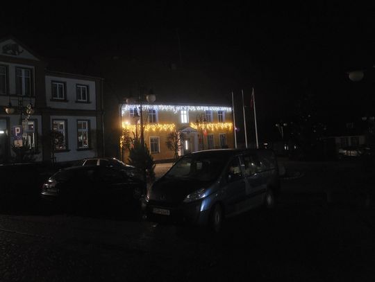 Oprócz sklepów i baru to jest jeszcze jeden rozświetlony budynek - to Urząd Miasta w Moryniu. Problem w tym, że te świecidełka wiszą tam cały rok. Teraz się świeci (co widać na zdjęciu), ale choinki i inne ozdoby świąteczne już nie Na placu można się potknąć...
