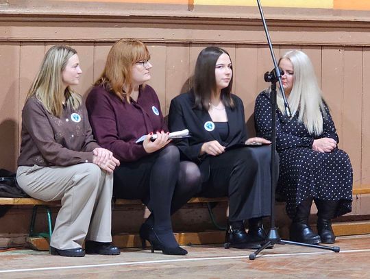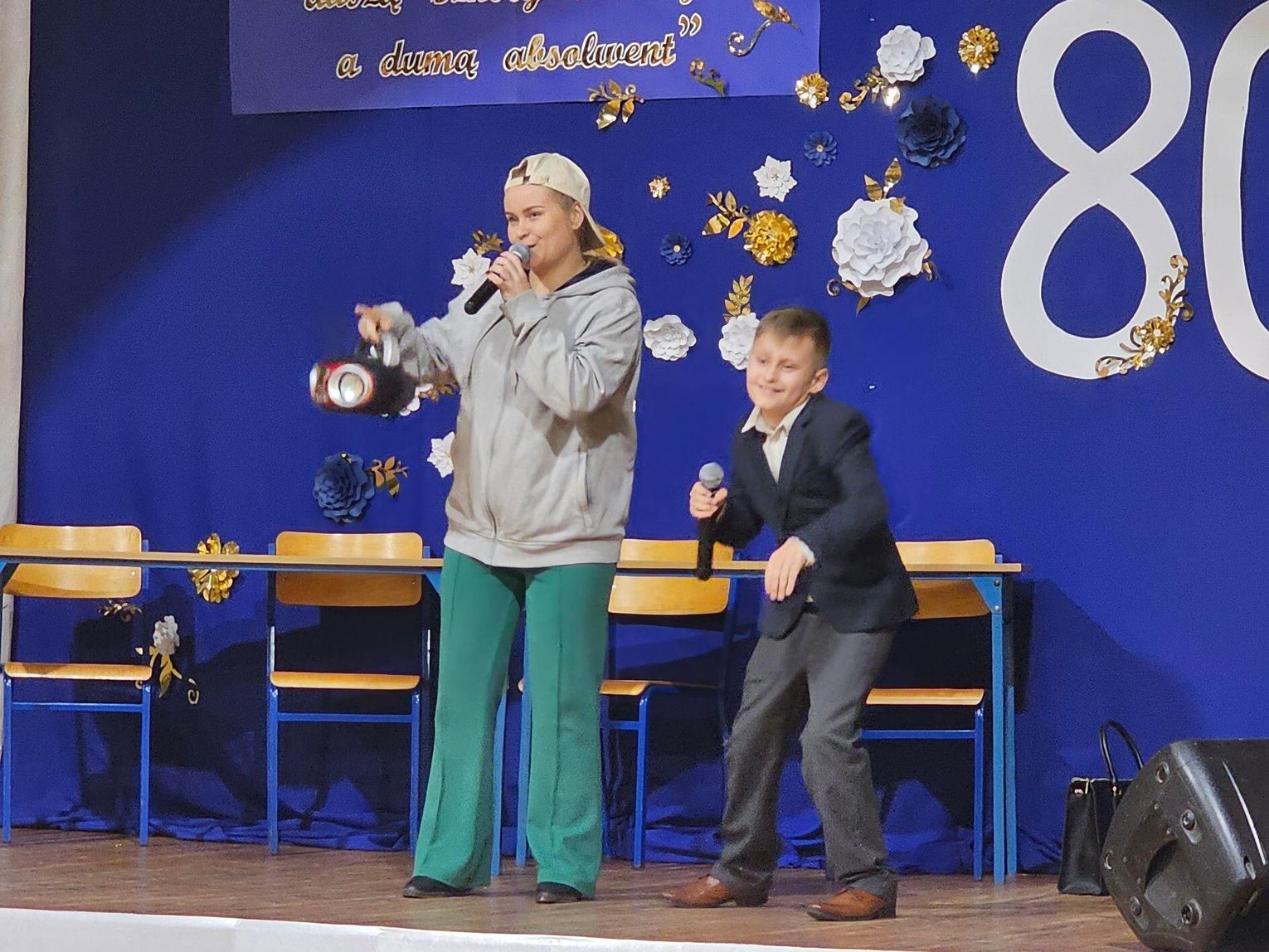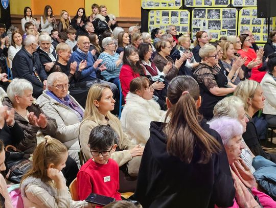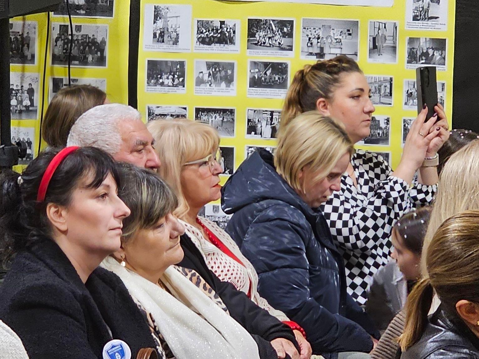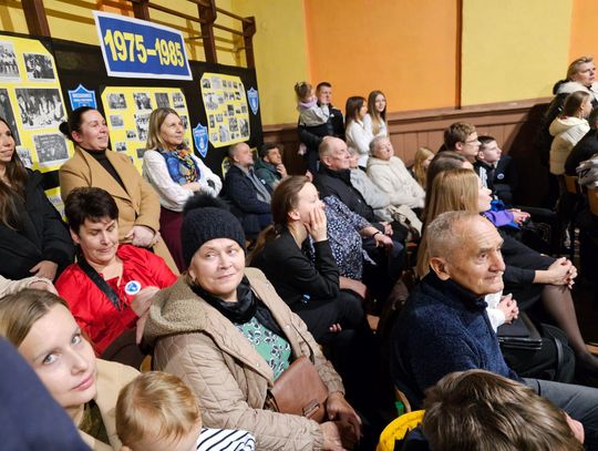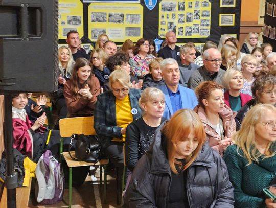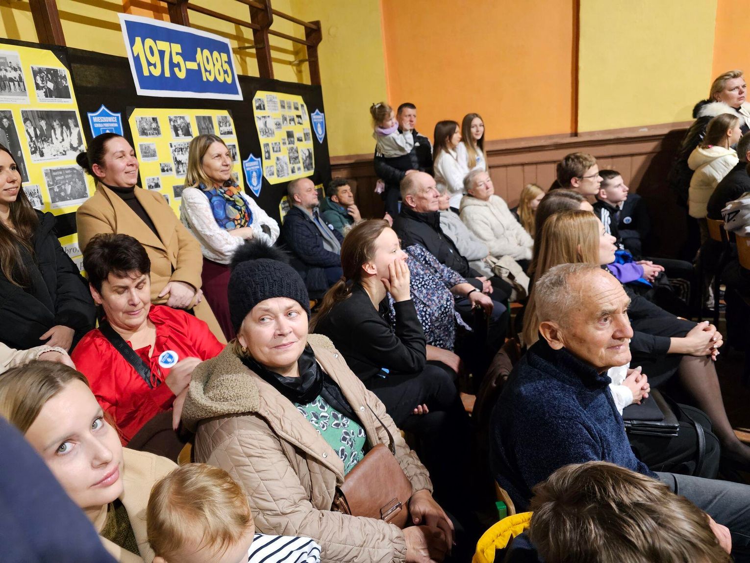 Następnie publiczność obejrzała bardzo ciekawą prezentację multimedialną przygotowaną przez nauczycieli: Joannę Karczewską i Marcina Bochutę, która przeprowadziła przez dzieje szkoły od 1945 roku do czasów bieżących. Archiwalne fotografie, daty i wspomnienia stworzyły most między dawnymi latami a tym, co miało za chwilę rozbrzmieć na scenie.