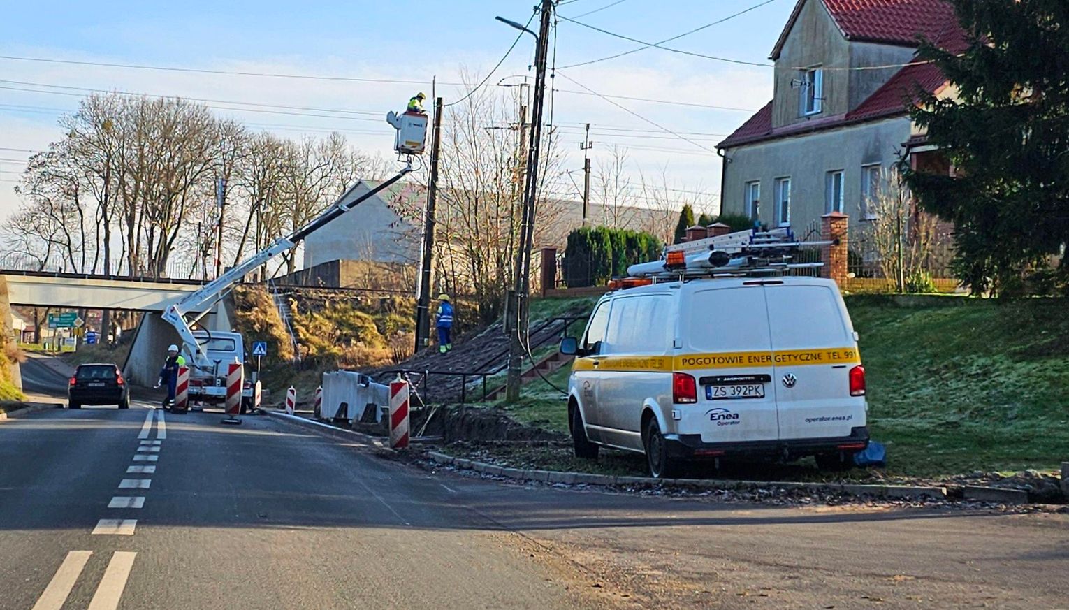 Głównym wykonawcą dzisiejszych robót była firma Enea. Aby sprawnie przeprowadzić niezbędne prace, energetycy sprowadzili na miejsce imponujący dźwig. Maszyna ta była kluczowa do montażu i konserwacji elementów sieci elektrycznej.