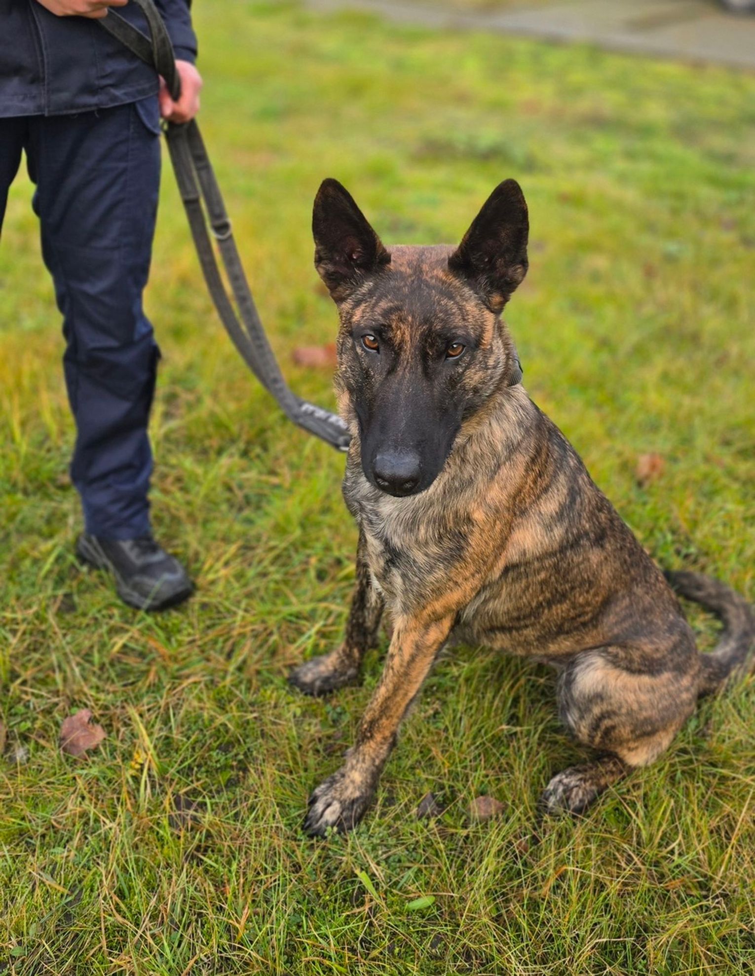 Na zdjęciach w fotogalerii widzimy Walkę - psa o pręgowanym, brązowo-czarnym umaszczeniu z czarną maską na pysku oraz stojącymi, czujnymi uszami.