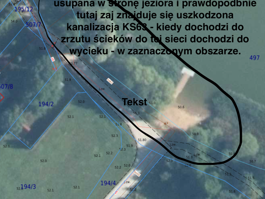 W mojej ocenie, podczas realizacji inwestycji drogowej mogło dojść do uszkodzenia sieci kanalizacyjnej, a w szczególności do nieszczelności w miejscu przebiegu tej infrastruktury w bezpośrednim sąsiedztwie jeziora. Z obserwacji wynika, że w momentach intensywnego przepompowywania ścieków z działek podłączonych do tej sieci dochodzi do ich wycieku bezpośrednio do jeziora.