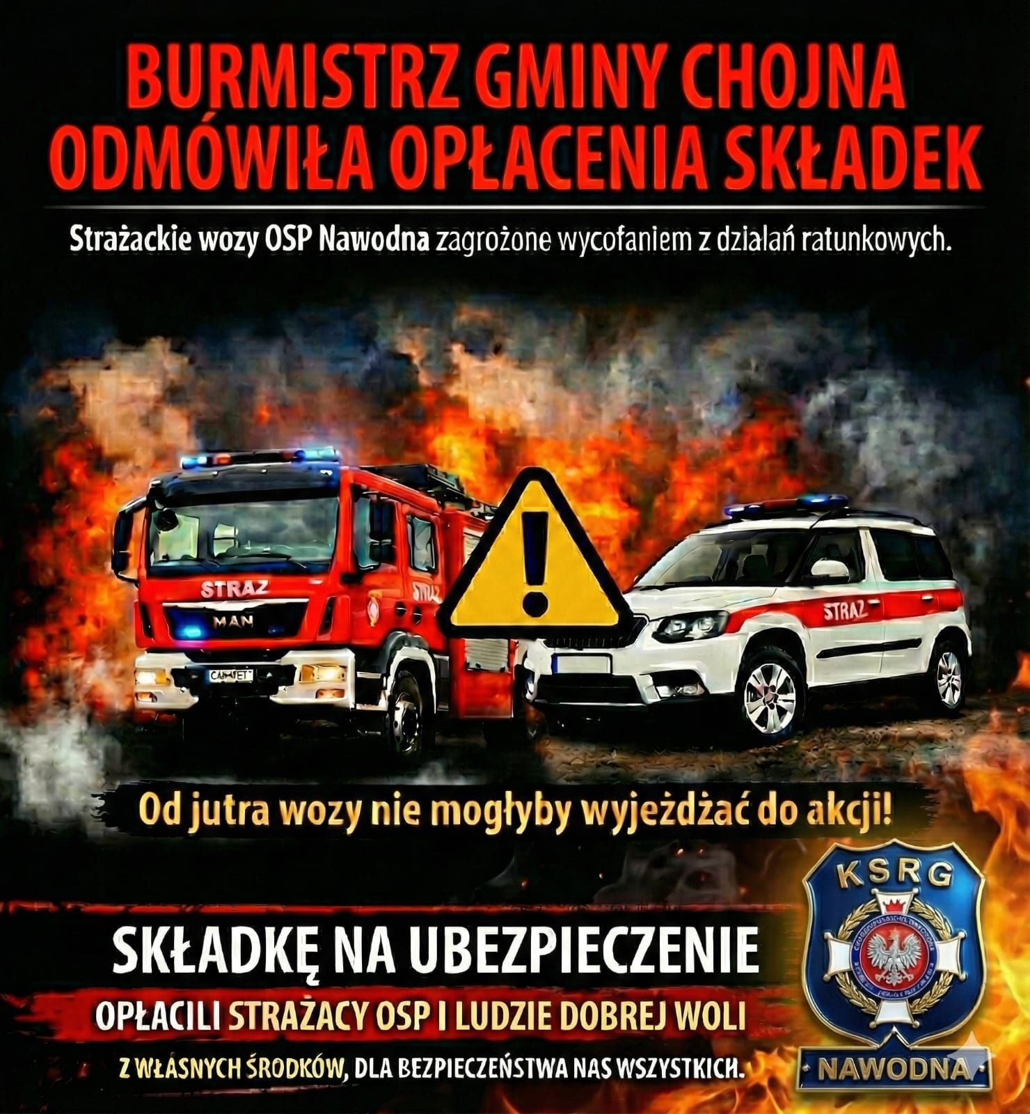 – Zapewnienie ciągłości ochrony życia i mienia mieszkańców jest zadaniem nadrzędnym. Brak ubezpieczenia oznaczałby natychmiastowe wycofanie wozów z podziału bojowego – tłumaczą rozgoryczeni strażacy z OSP Nawodna.