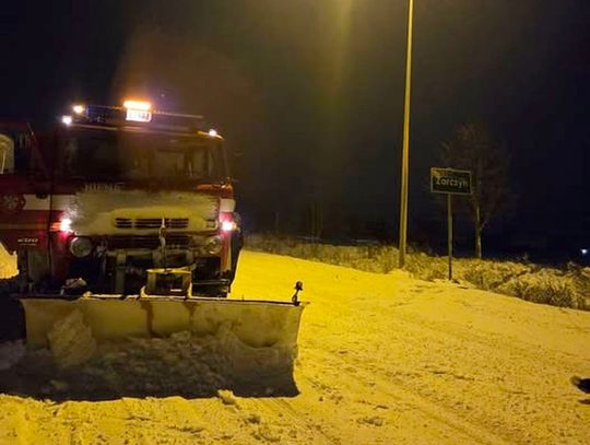 Na zdjęciach z dzisiejszej akcji widać, jak strażacy pracują, kiedy jeszcze jest ciemno i odśnieżają przy świetle latarni, oczyszczając kluczowe punkty w miejscowości.