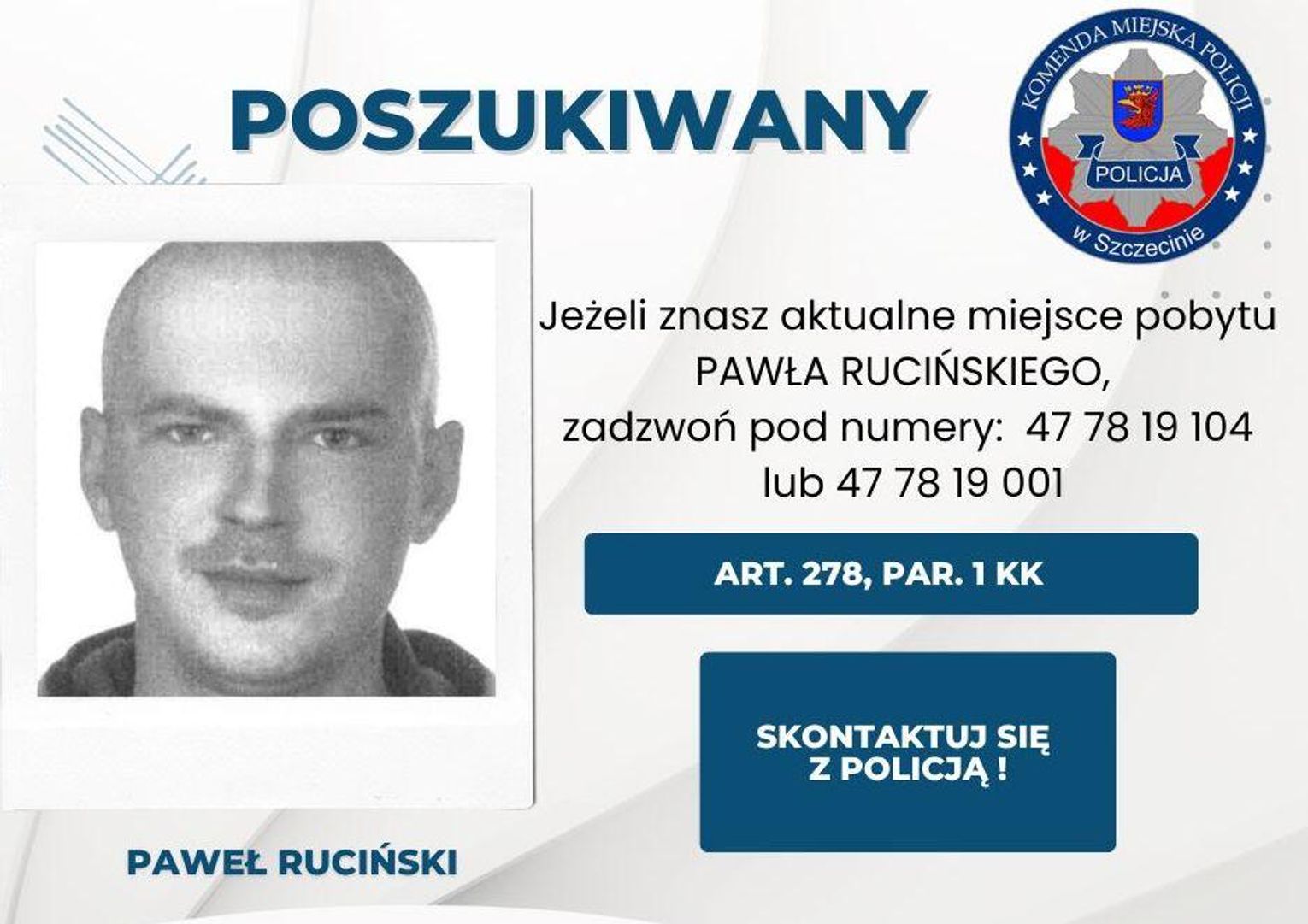 Paweł Ruciński – poszukiwany na podstawie Kodeksu Karnego (Art. 278, par. 1), który dotyczy zaboru w celu przywłaszczenia cudzej rzeczy ruchomej, czyli kradzieży.